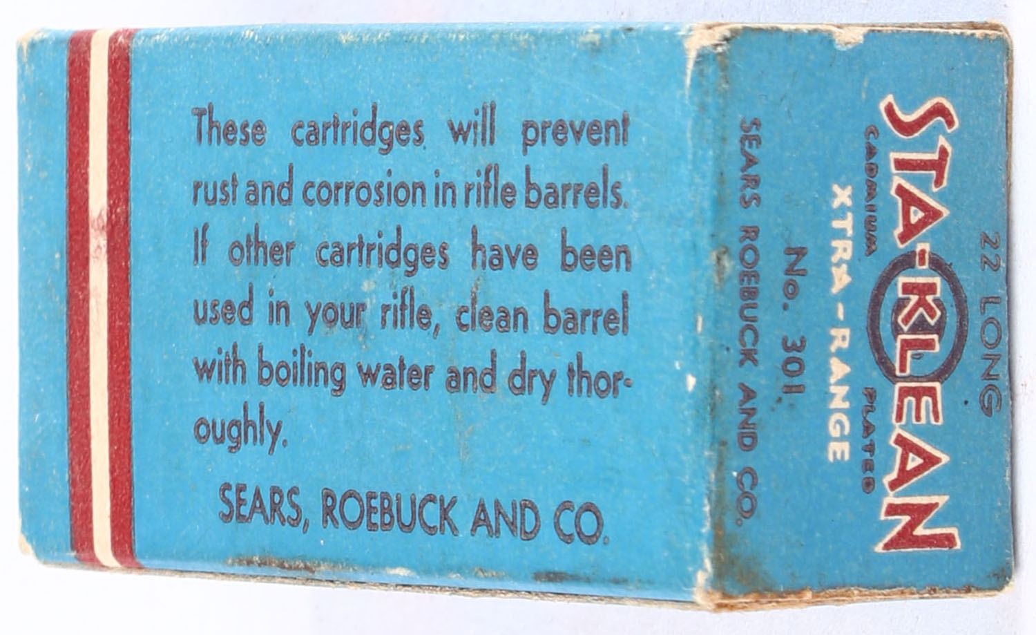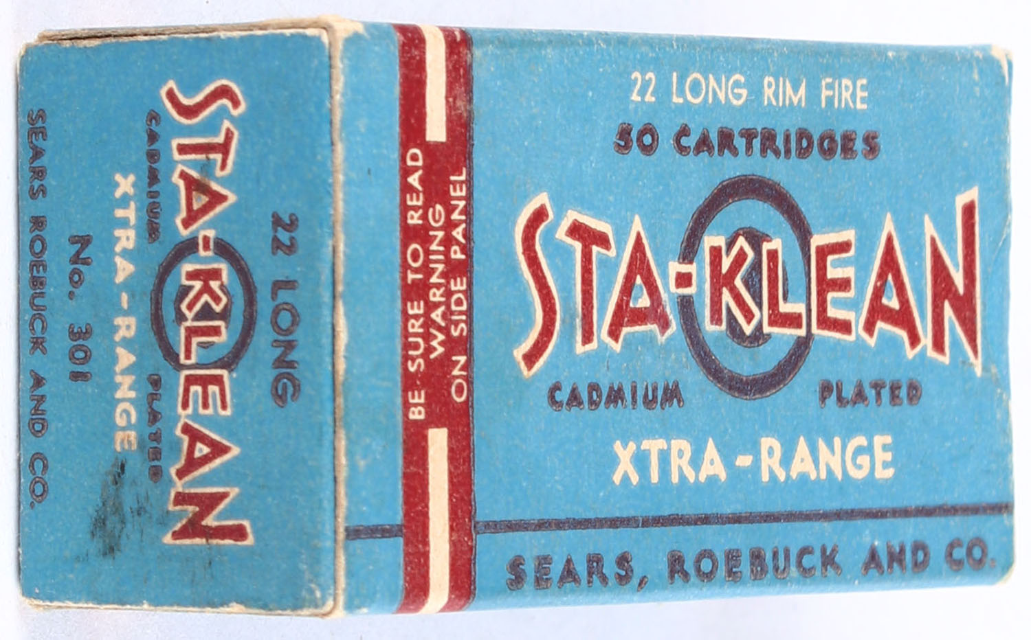 Sears, Sta-Klean Cadmium Plated, .22 Long, RHWeb: SEARS-4 L-1a, Full, 1pc. Blue maroon & white box, box is solid with excellent to minty color, very minor corner wear, edges are crisp, end flaps are solid, ammo is excellent. Grade: Excellent ++ - Value: 40 to 60