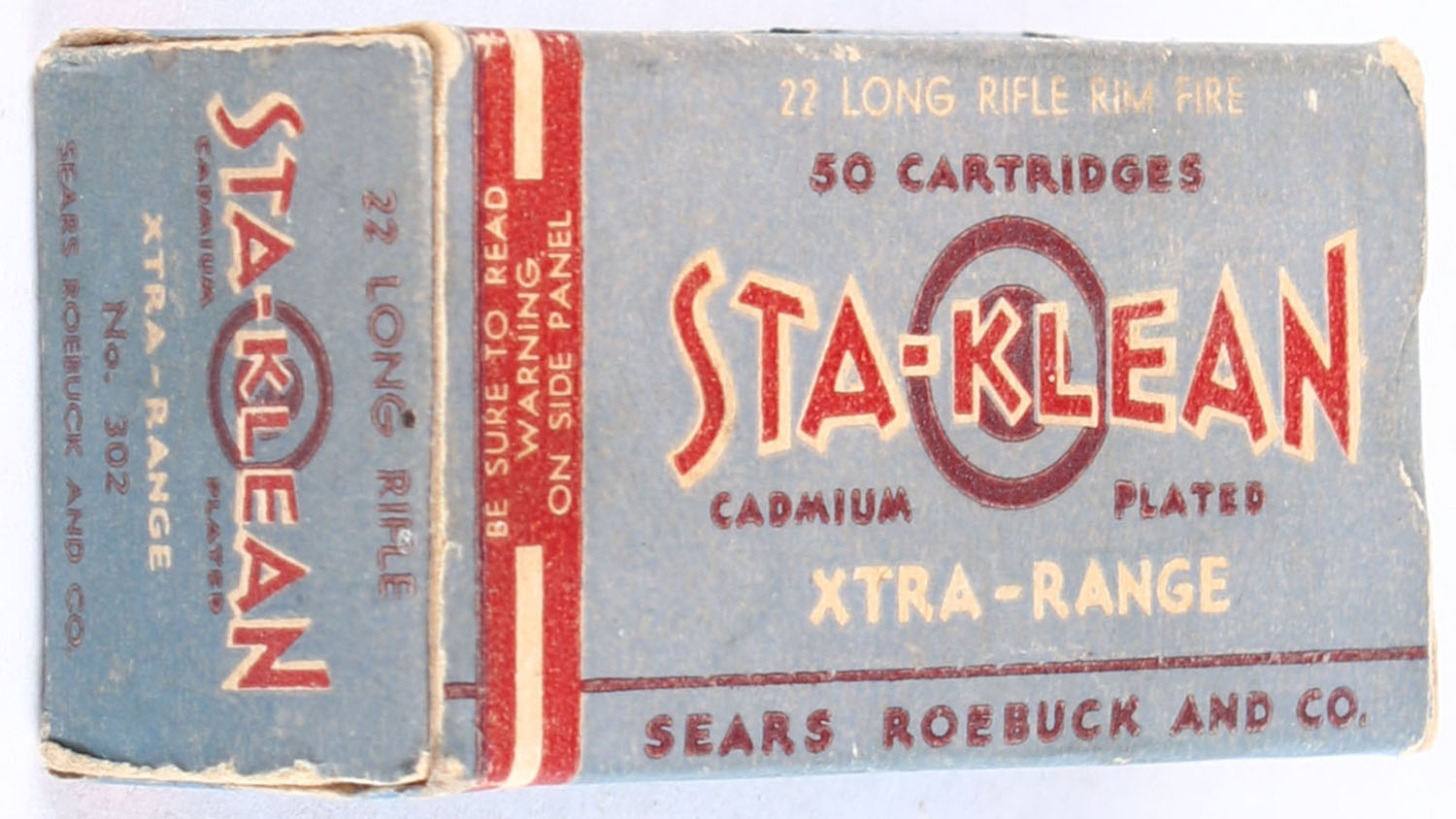 Sears, Sta-Klean Cadmium Plated, .22 Long Rifle, RHWeb: SEARS-4 LR-1a, Full of *incorrect ammo (correct H/S, box is full of cadmium plated hollow points), 1pc. Blue maroon & white box, box is solid with very good color, some color fading, minor corner wear, edges are crisp, end flaps are solid, ammo is excellent. Grade: Very Good ++ - Value: 30 to 45
