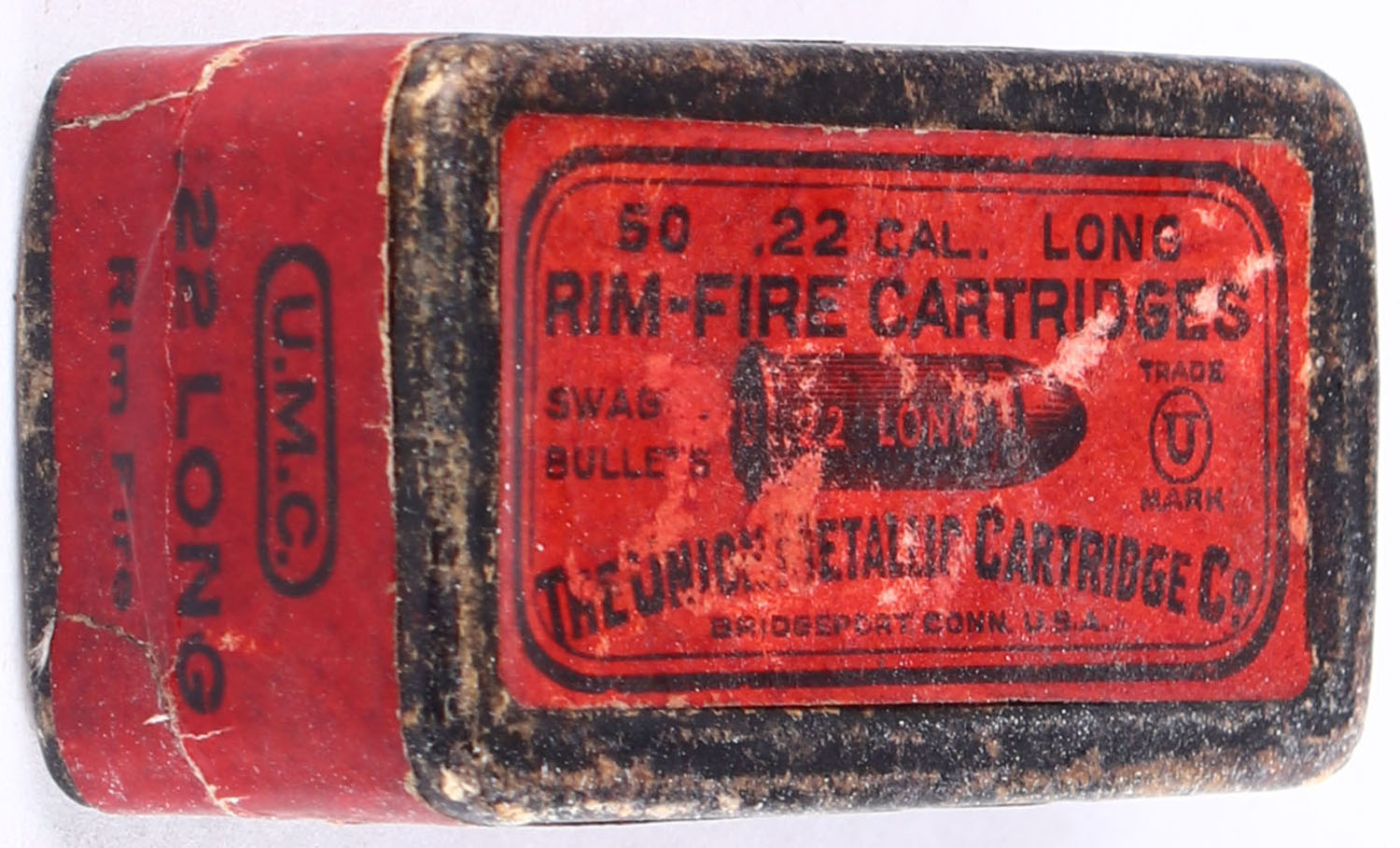 UMC, Rim Fire Cartridges, .22 Long, Swaged Bullet, RHWeb: UMC-8 L-1a, FULL & SEALED*, 2pc. Black mottled box with red top & side sealing labels, box is solid with very good to excellent color, some shelf wear, minor edge & corner wear, label has been unsealed on front side & right end, label is intact. Grade: Very Good + - Value: 80 to 120