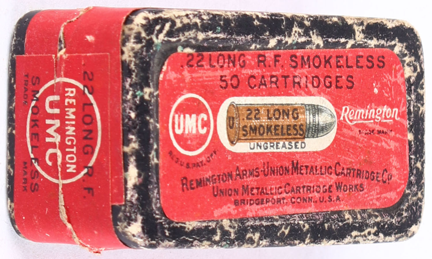 REM-UMC, R.F. Smokeless Cartridges, .22 Long, Ungreased, RHWeb: REM-1 L-5A, Partial 24rds., 2pc. Black mottled box with red top & side sealing labels, box is solid with excellent color, minor shelf wear, minor edge & corner wear, labels are intact, ammo is excellent. Grade: Excellent - Value: 24 to 36