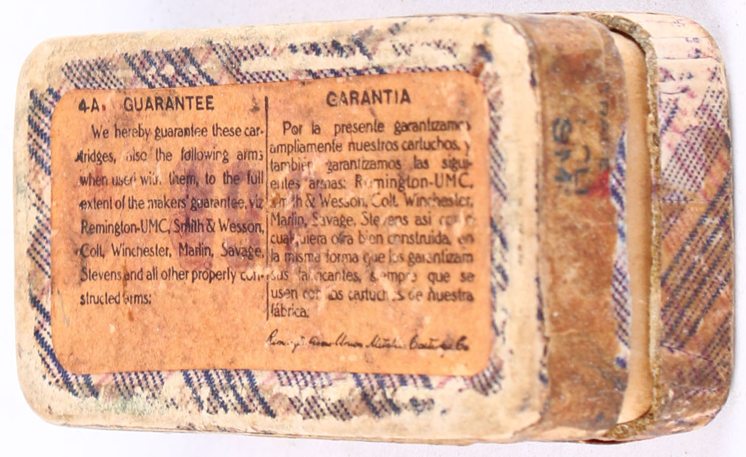 REM-UMC, R.F. Smokeless Cartridges, .22 Short Hollow Point, 29 Grs. Bullet, RHWeb: REM-2 S-7A, Partial 43rds. 2pc. Purple fabric box with buff top & side sealing labels, box is solid with good color, age soiling, some edge & corner wear, side sealing label is 60% intact, ammo is good. Grade: Good ++ - Value: 20 to 30