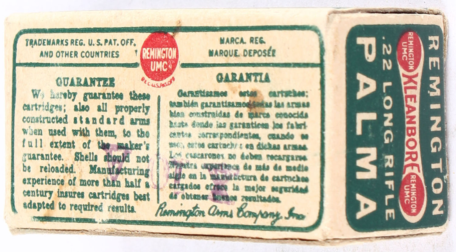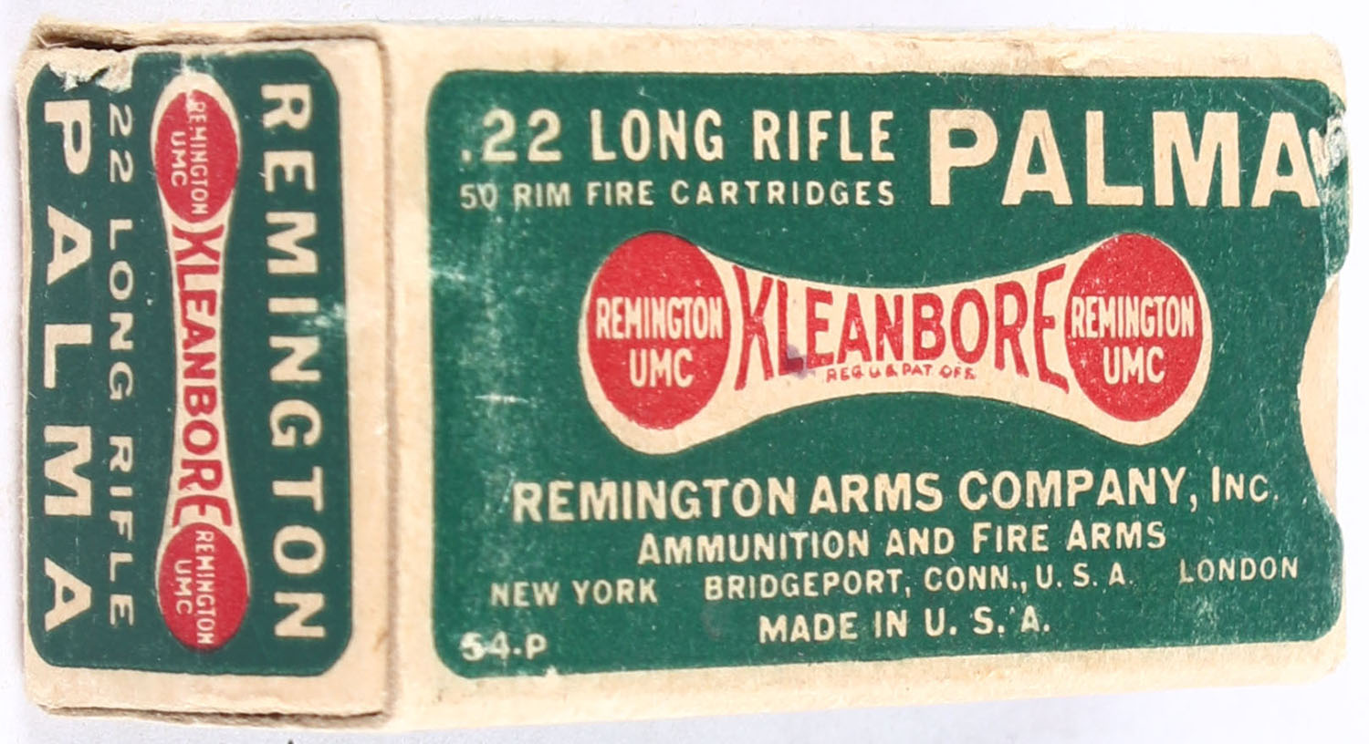 Remington, Palma Kleanbore, .22 Long Rifle, RHWeb: REM-52 LR-8, Full, 1pc. Green buff & red dog bone box, box is solid with excellent color, very minor age soiling & shelf wear, some corner wear, very minor edge wear, end flaps are solid, ammo is excellent. Grade: Very Good ++ - Value: 40 to 60