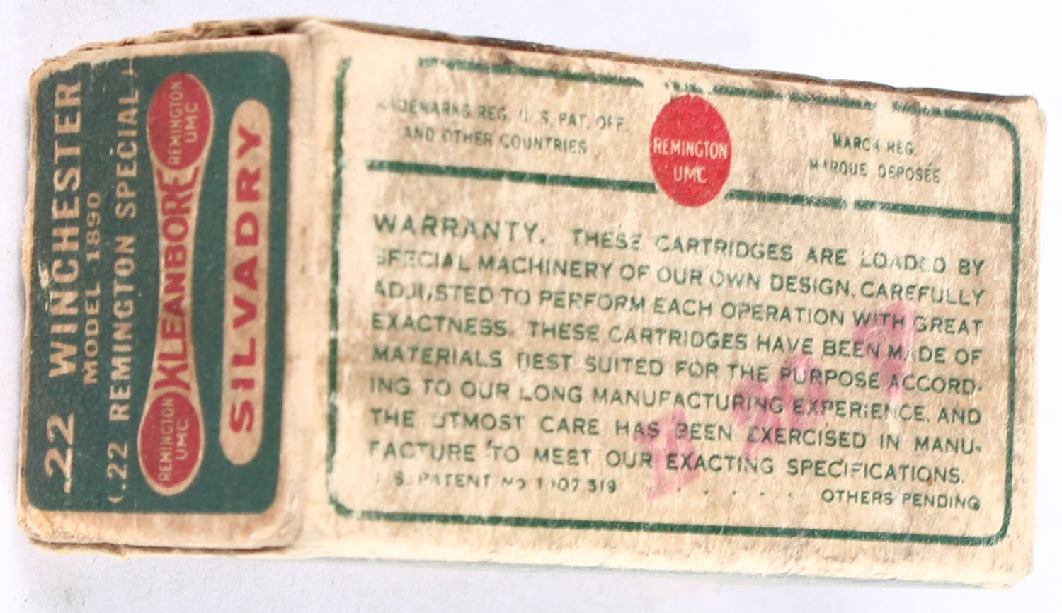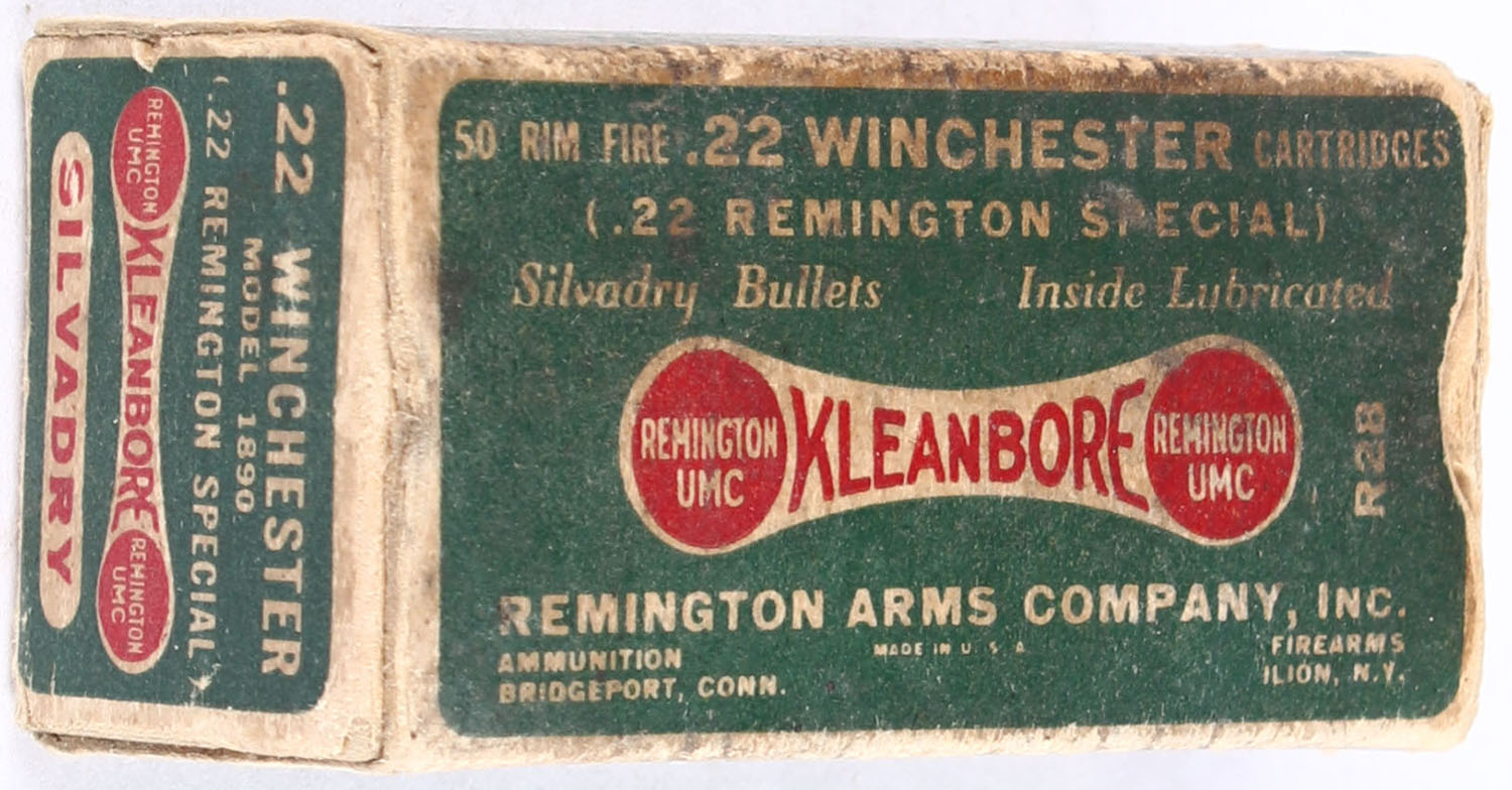 Remington, Kleanbore Silvadry Bullets, .22 Winchester Rim Fire, RHWeb: REM-7.3 WRF-1b, Full, 1pc. Green buff & red dog bone box, box is solid with good color, age soiling, staining, some corner wear, minor edge wear, end flaps are solid, ammo is excellent. Grade: Very Good - Value: 16 to 24