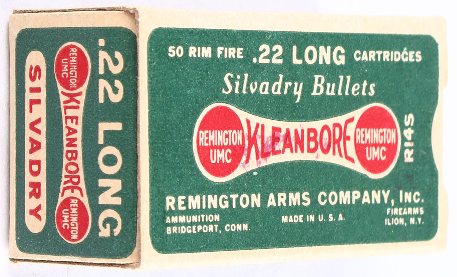 Remington, Kleanbore Silvadry, .22 Long, RHWeb: REM-7.3 L-1b, Full, 1pc. Green buff & red dog bone box, box is solid with excellent color, very minor shelf wear, corners are mostly sharp, edges are crisp, end flaps are solid, ammo is excellent. Grade: Excellent + - Value: 120 to 180