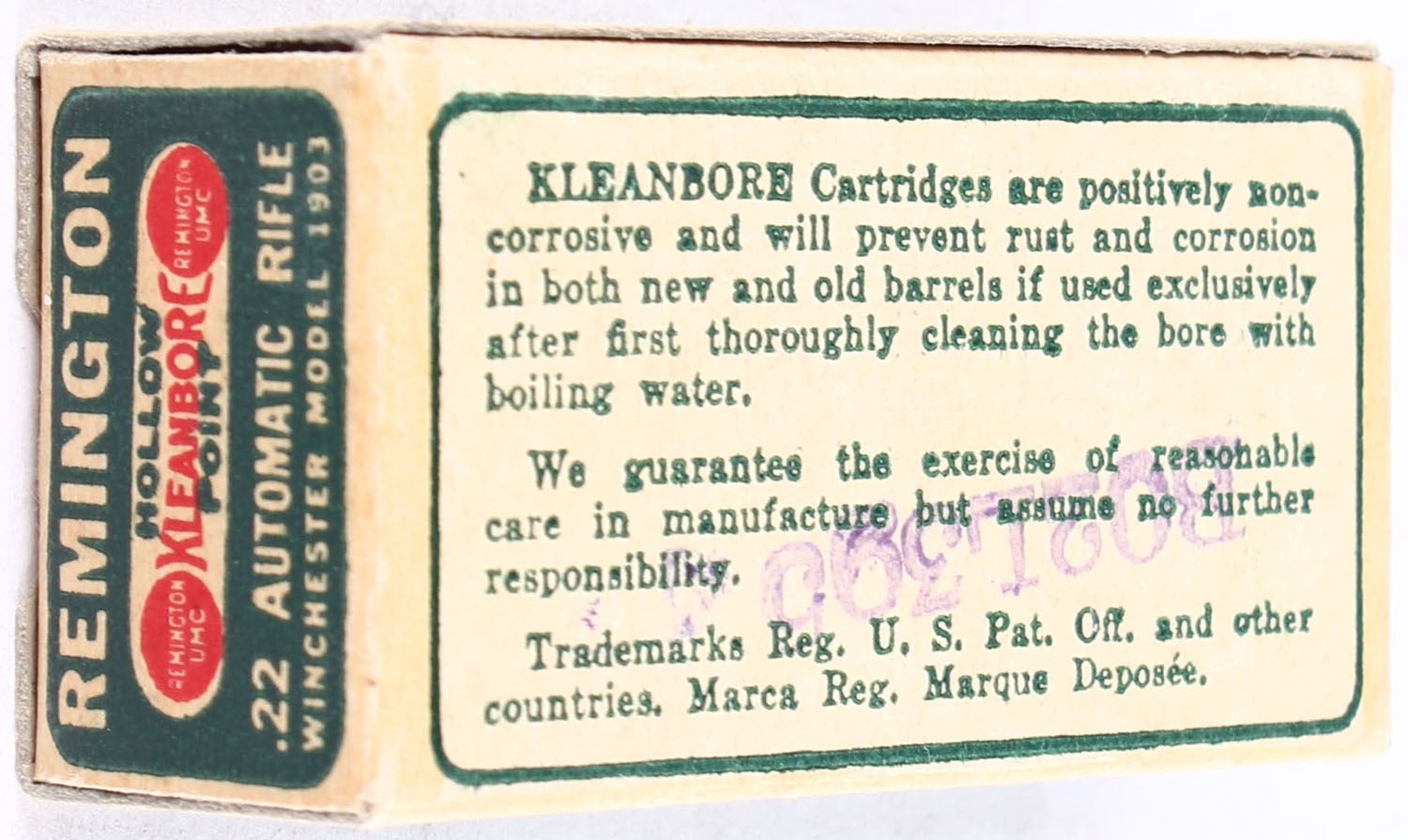 Remington, Kleanbore, .22 Winchester Automatic Hollow Point, RHWeb: REM-7.1B WA-2d, Full, 1pc. Green buff & white dog bone box, box is solid with excellent color, very minor age soiling, corners are sharp, edges are crisp, end flaps are solid, ammo is excellent. Grade: Excellent ++ - Value: 200 to 300