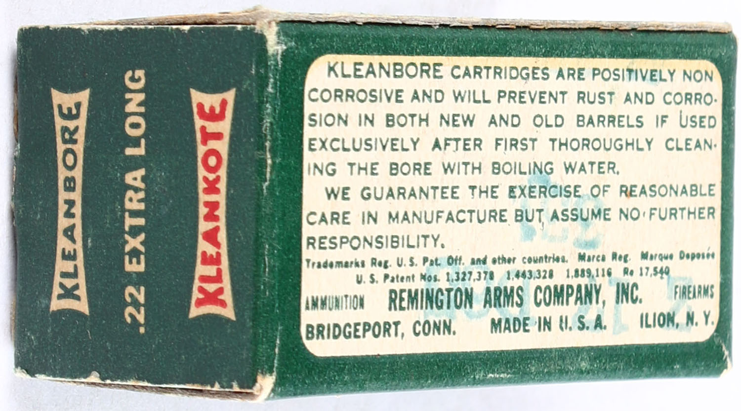 Remington, Kleanbore Kleankote, .22 Extra Long, Standard Velocity, RHWeb: REM-9 XL-1b, Full, 1pc. Green white & red box, box is solid with excellent color, minor corner wear, edges are crisp, end flaps are solid, ammo is excellent. Grade: Excellent + - Value: 160 to 240