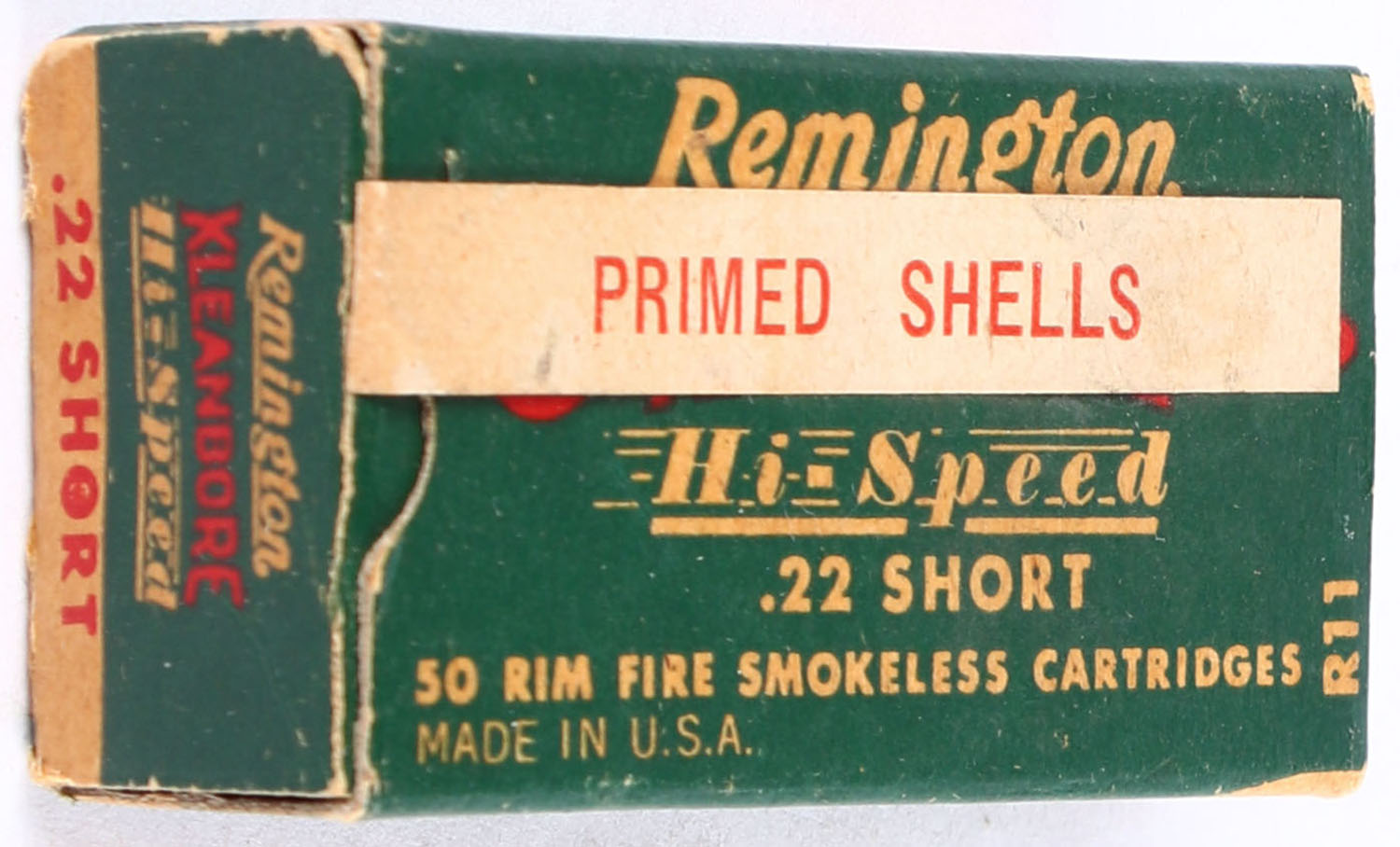 Remington, Kleanbore Hi-Speed, .22 Short Primed Shells, RHWeb: REM-10 S-2, Full, 1pc. Green buff & red box with white ''Primed Shells'' over-label, box is solid with excellent color, very minor corner wear, edges are crisp, end flaps are solid, over-label is intact but is beginning to peel, ammo is minty. Grade: Excellent + - Value: 40 to 60