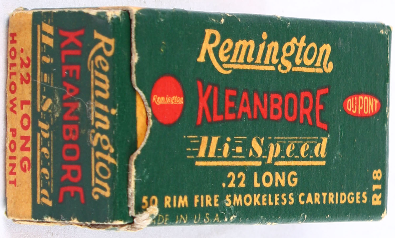 Remington, Kleanbore Hi-Speed, .22 Long Hollow Point, RHWeb: REM-10 L-2b, Partial 41rds., 1pc. Green buff & red box, box is solid with excellent color, some corner wear, very minor edge wear, end flaps are solid, ammo is excellent. Grade: Very Good ++ - Value: 8 to 12