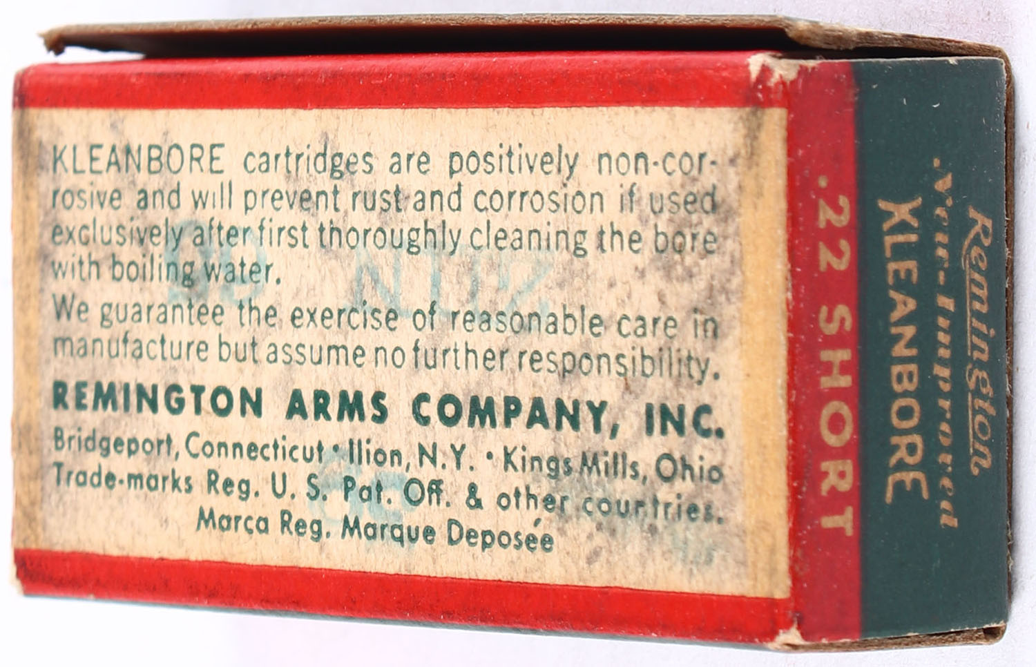 Remington, New and Improved Kleanbore, .22 Short, RHWeb: REM-11 S-1, Full, 1pc. Green buff & red box, box is solid with very good to excellent color, minor age soiling, factory seam has unadhered, minor corner wear, edges are crisp, end flaps are solid, ammo is excellent. Grade: Very Good ++ - Value: 10 to 15