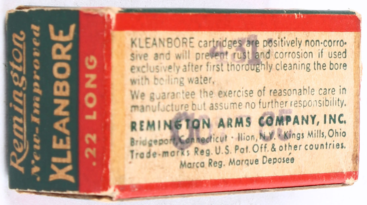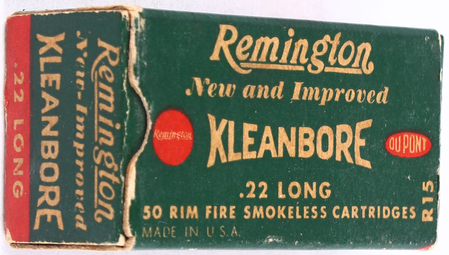 Remington, New and Improved Kleanbore, .22 Long, RHWeb: REM-11 S-1, Full, 1pc. Green buff & red box, box is solid with very good color, some age soiling, minor edge & corner wear, end flaps are solid, ammo is excellent. Grade: Very Good ++ - Value: 12 to 18