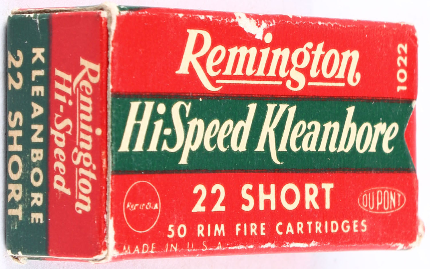 Remington, Hi-Speed Kleanbore, .22 Short, RHWeb: REM-14 S-1b, Full, 1pc. Red white & green box, box is solid with excellent color, some corner wear, minor edge wear, end flaps are solid, ammo is excellent to minty. Grade: Excellent - Value: 12 to 18