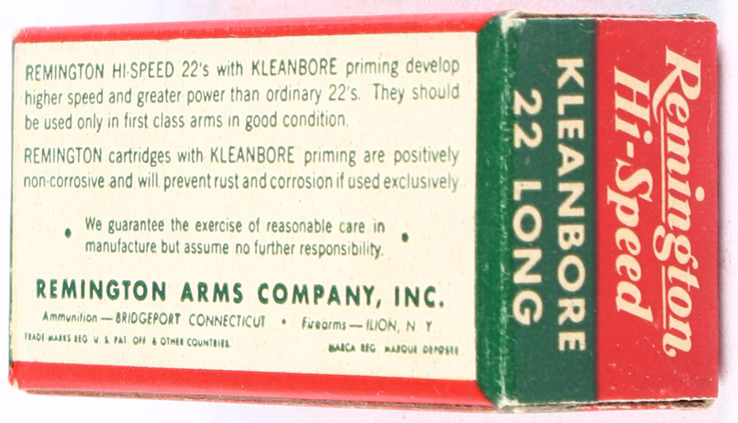 Remington, Hi-Speed Kleanbore, .22 Long, RHWeb: REM-14 L-1b, Full, 1pc. Red white & green box, box is near mint with minty color, only very minor corner wear, edges are crisp, end flaps are solid, ammo is minty. Grade: Excellent ++ - Value: 16 to 24