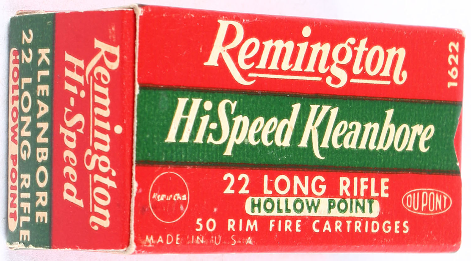 Remington, Hi-Speed Kleanbore, .22 Long Rifle Hollow Point, RHWeb: REM-14 LR-4c, Full, 1pc. Red white & green box, box is solid with excellent very minor age soiling & corner wear, edges are crisp, end flaps are solid, ammo is minty. Grade: Excellent ++ - Value: 20 to 30