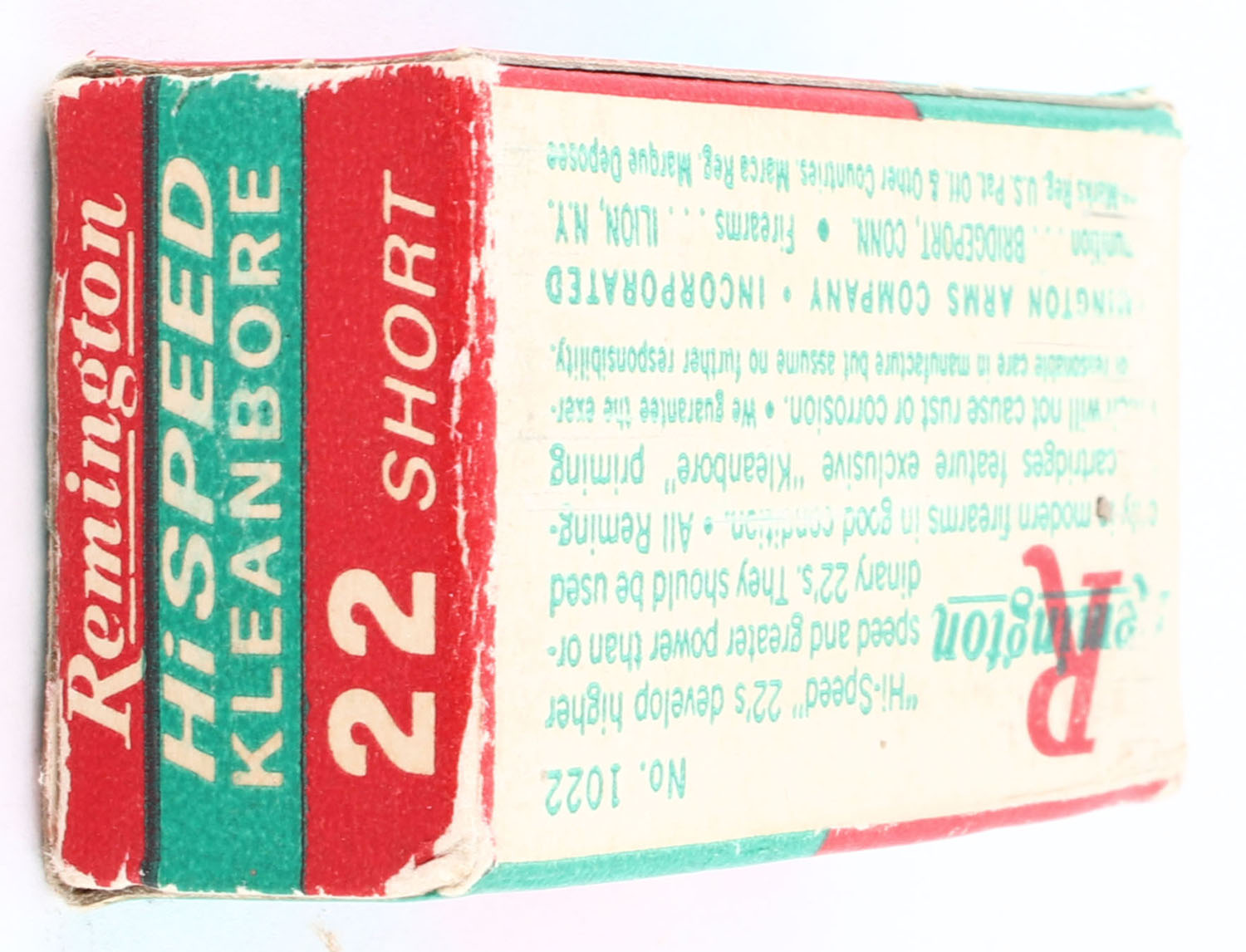 Remington, Hi-Speed, .22 Short, Full, 1pc., red, green & white box, box is solid with excellent color, very minor corner wear, edges are crisp, end flaps are nice, ammo is excellent. Grade: Excellent - Value: 8 to 15