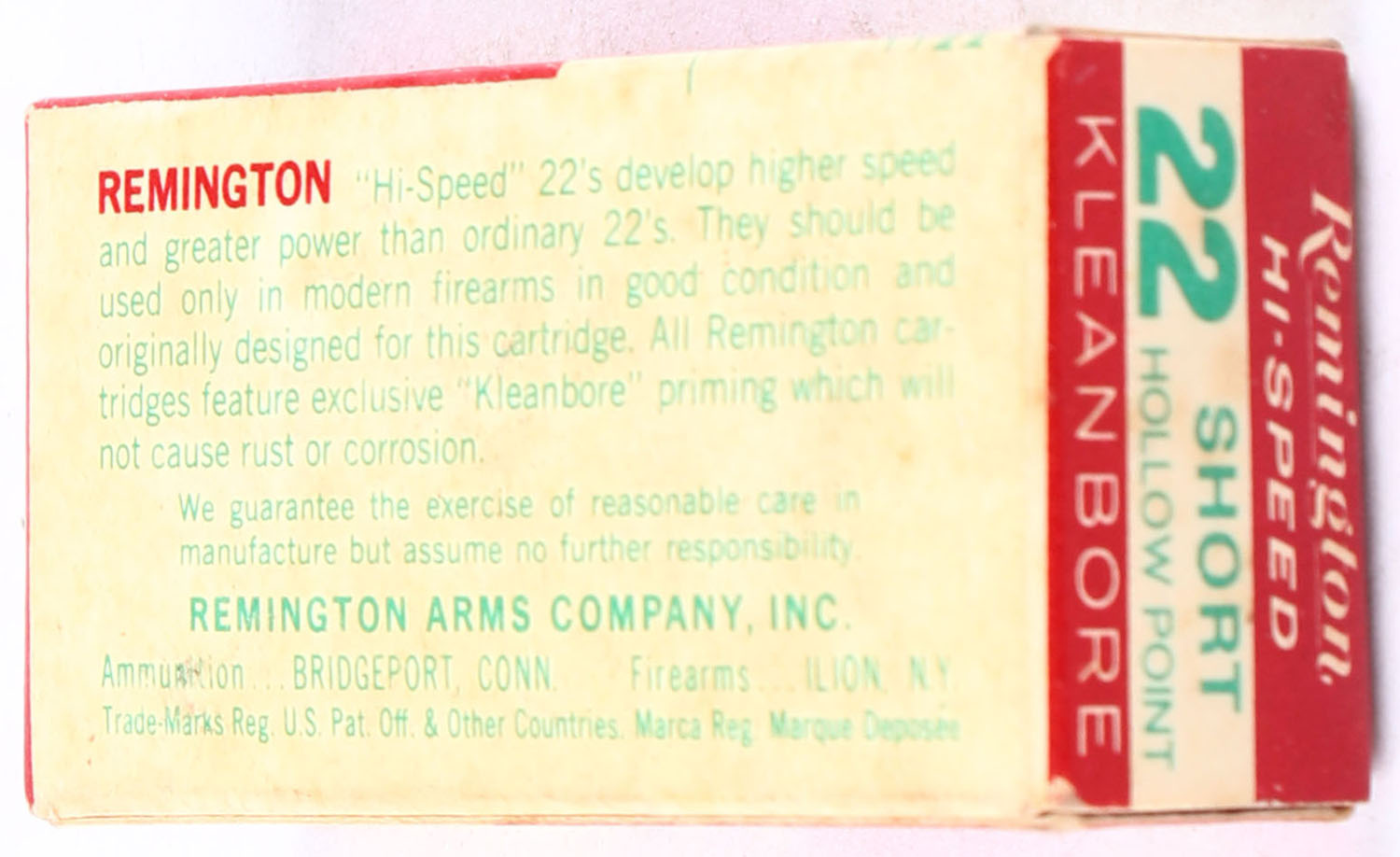 Remington, Hi-Speed, .22 Short Hollow Point, ''Golden'' Bullet, Full, 1pc. red white & green box, box is solid with excellent color, very minor age soiling & corner wear, edges are crisp, end flaps are solid, ammo is excellent. Grade: Excellent - Value: 8 to 15