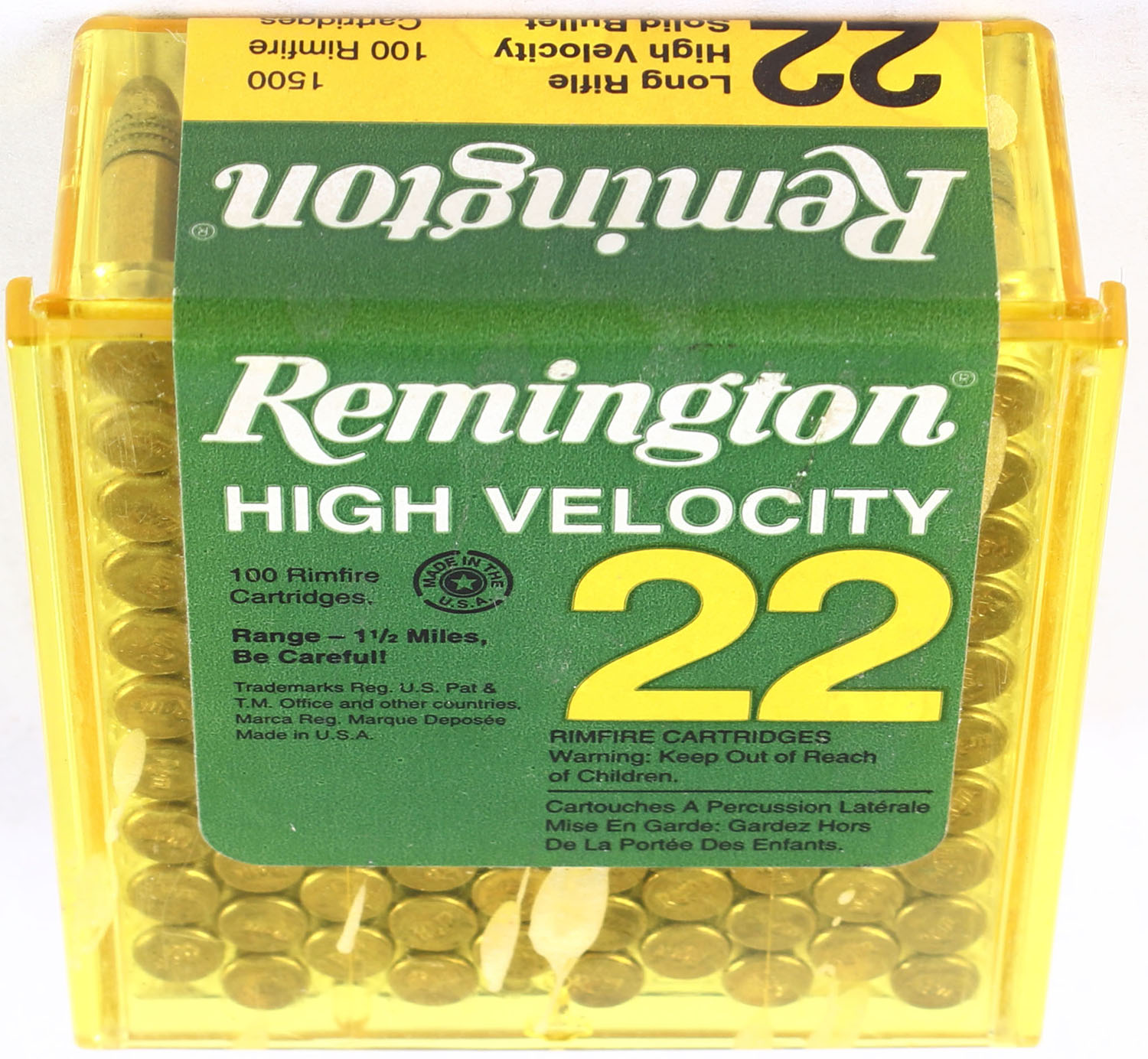 Remington, High Velocity, .22 Long Rifle, FULL & SEALED, 2pc. yellow plastic tray with green & yellow sealing label, box is solid, label is intact with excellent color, ammo appears minty. Grade: Excellent ++ - Value: 10 to 40
