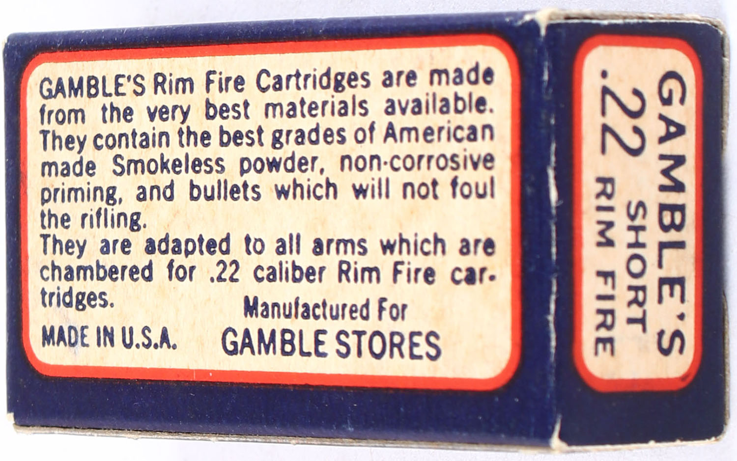 Gambles, Rim Fire Cartridges, .22 Short, RHWeb: GS-1 S-3, Full, 1pc., blue white & red box, box is solid with excellent color, minor age soiling, edges are crisp, end flaps are solid, ammo is near mint. Grade: Excellent ++ - Value: 50 to 250
