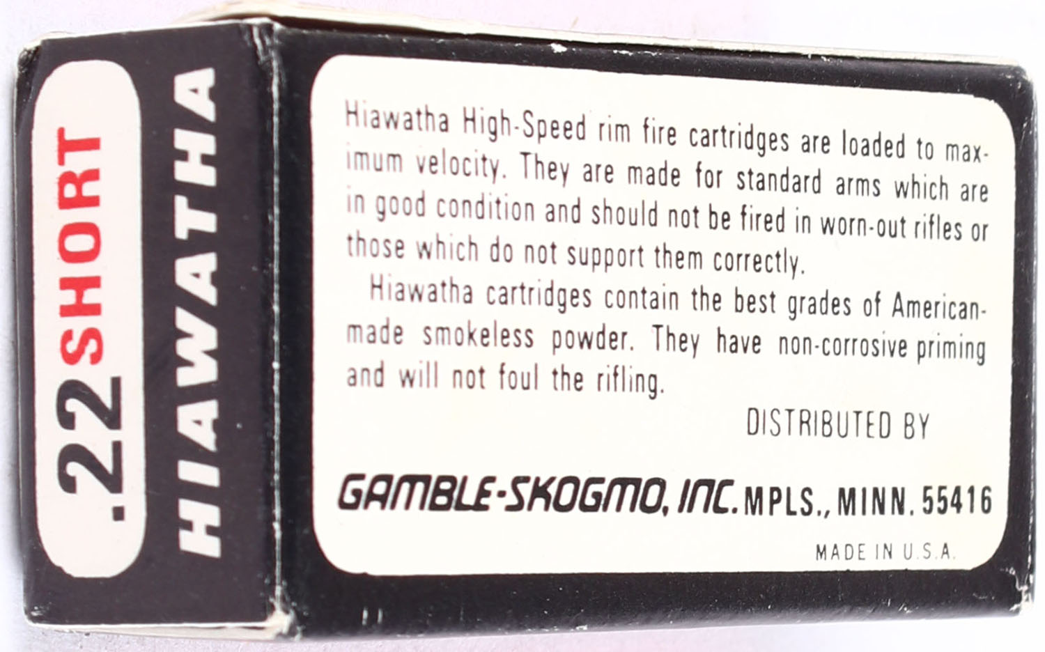 Gambles, Hiawatha, .22 Short, RHWeb: GS-5 S-1a, Full, 1pc., white black & red box, box is solid with excellent color, edges are crisp, end flaps are solid, ammo is excellent to minty. Grade: Excellent ++ - Value: 40 to 120