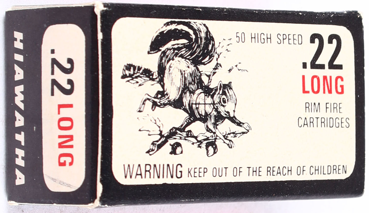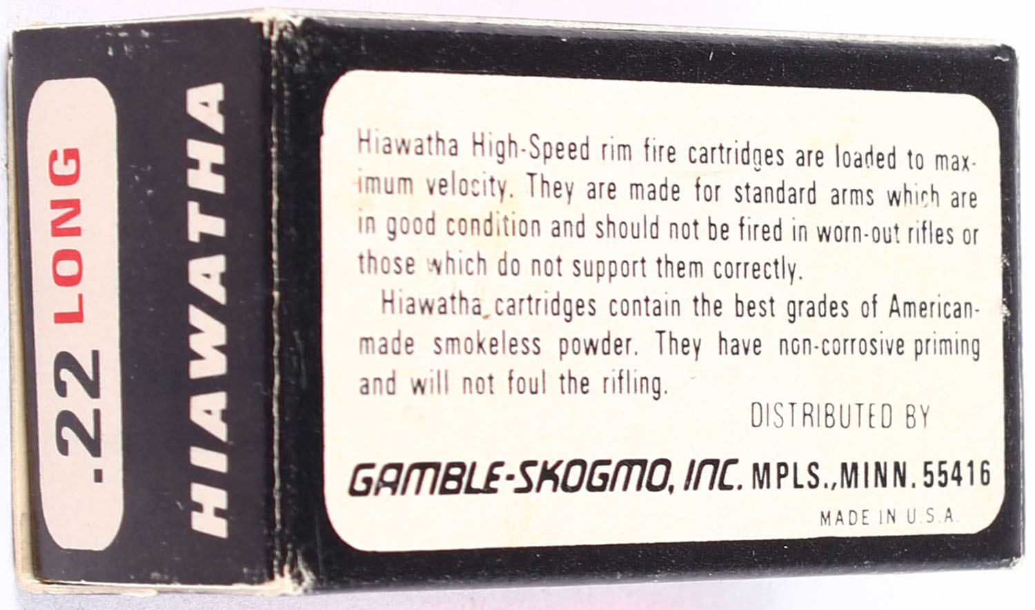 Gambles, Hiawatha, .22 Long, RHWeb: GS-5 L-1a, Full, 1pc., white black & red box, box is solid with excellent color, edges are crisp, end flaps are solid, ammo is excellent to minty. Grade: Excellent ++ - Value: 40 to 120
