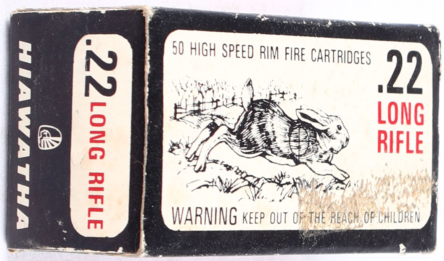 Gambles, Hiawatha, .22 Long Rifle, RHWeb: GS-5 LR-1c, Full, 1pc., white black & red box, box has tape to sides with nice color, edges are crisp, end flaps are solid, ammo is excellent to minty. Grade: Excellent - Value: 30 to 100