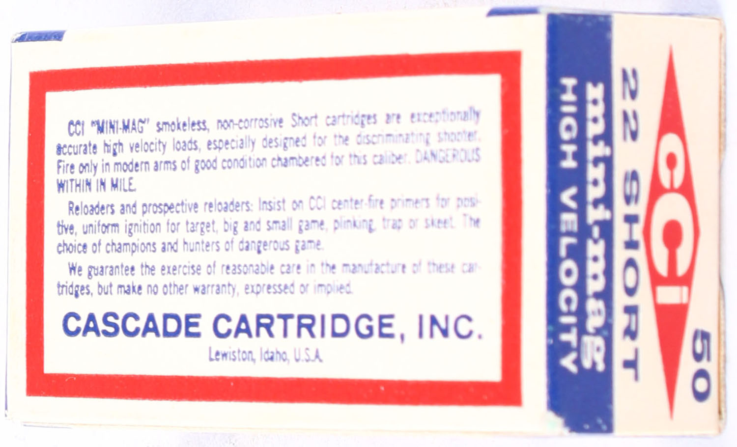 CCi, mini-mag, .22 Short, RHWeb: CCI-1 S-5a, Full, 1pc. White blue & red box, box is solid with minty color, very minor corner wear, edges are crisp, end flaps are rigid, ammo is minty. Grade: Excellent ++ - Value: 6 to 12
