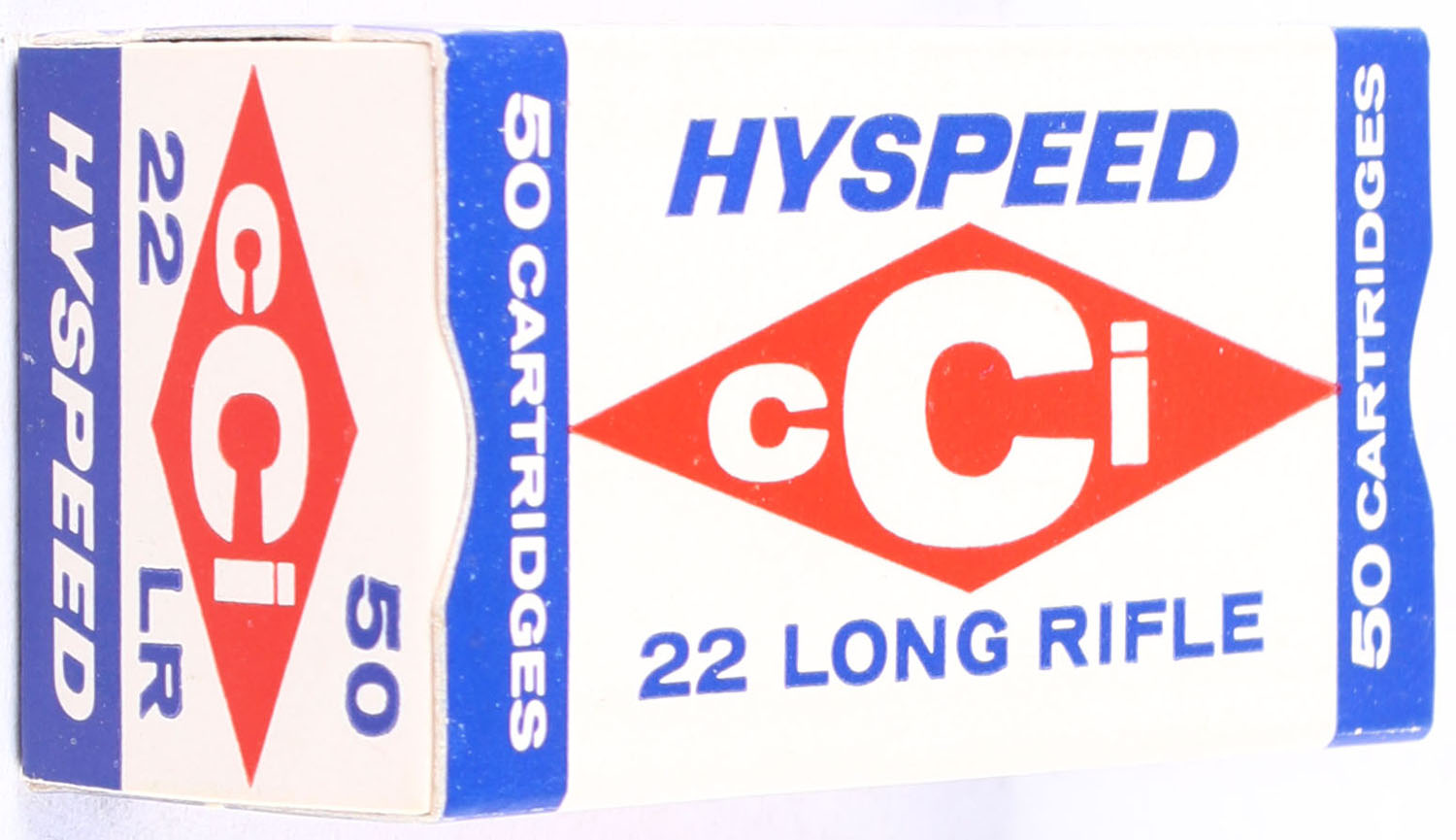 CCi, Hyspeed, .22 Long Rifle, RHWeb: CCI-1 LR-1, Full, 1pc., white blue & red box, box is solid with minty color, corners are sharp, edges are crisp, end flaps are rigid, ammo is minty. Grade: Excellent ++ - Value: 10 to 20