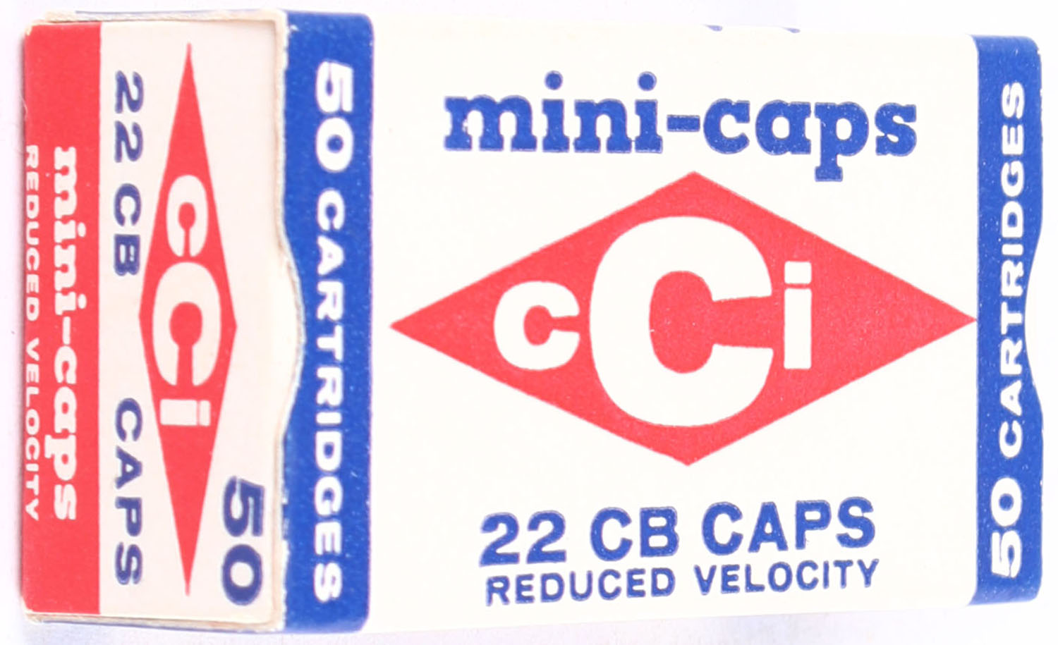 CCi, mini-caps, .22 CB Caps, reduced velocity, RHWeb: CCI-2 CB-1b, Full, 1pc., white blue & red box, box is solid with minty color, edges are crisp, end flaps are rigid, ammo is minty. Grade: Excellent ++ - Value: 10 to 20