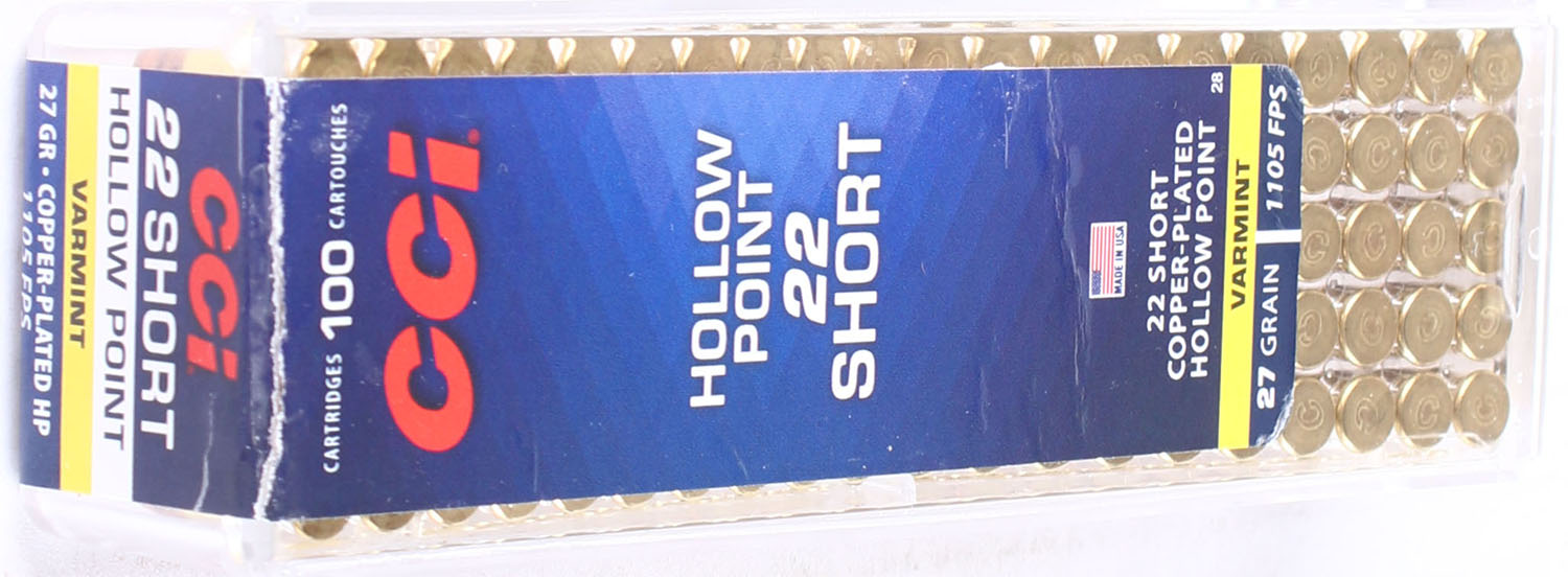 CCi, Varmint, .22 Short Hollow Point, 27 Grain Copper-Plated Hollow Point, 1105 FPS, FULL & SEALED, 2pc. Clear plastic tray with blue sealing label, box is MINT with minty color, label is intact, ammo appears minty. Grade: MINT - Value: 12 to 18