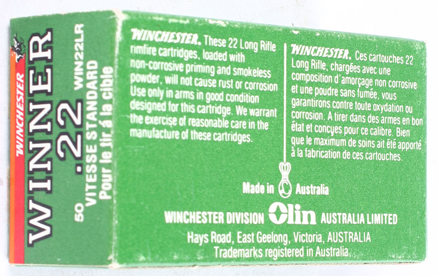 Winchester, Winner .22, .22 Long Rifle, Standard Velocity, RHWeb: (Australia) WIN-1 LR-1a, Full, 1pc. Green red & orange box, box is near mint with minty color, only very minor corner wear, edges are mostly crisp, end flaps are solid, ammo is minty. Grade: Excellent ++ - Value: 40 to 60
