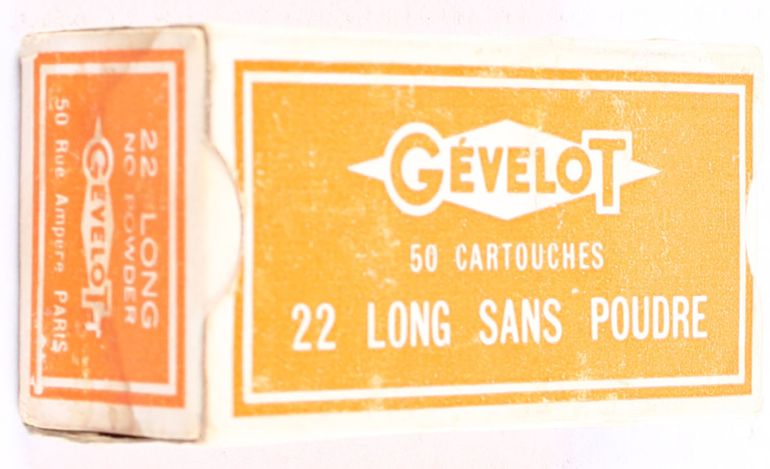 Gevelot, Sans Poudre, .22 Long Powderless, Stainless, RHWEB: (France) G-6.5 L-1, Full, 1pc. Orange & white box, box is solid with very good color, minor age soiling, some shelf wear, very minor edge & corner wear, end flaps are solid, ammo is excellent to minty. Grade: Very Good + - Value: 10 to 15