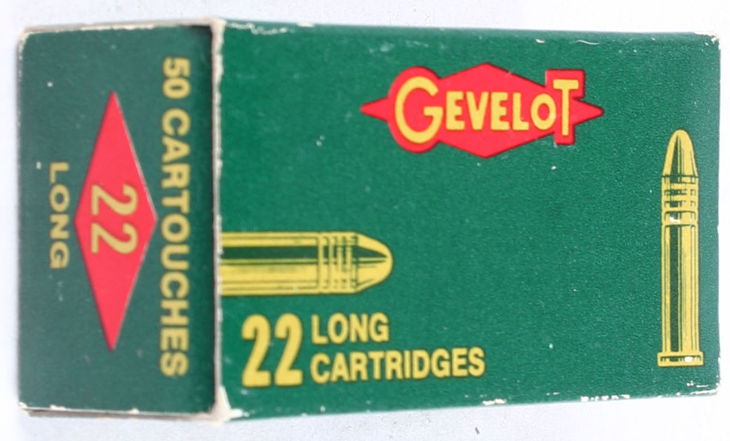Gevelot, .22 Long, RHWEB: (Canada) GG-2 L-1a, Full, 1pc. Green gold & red box, box is solid with minty color, very minor edge & corner wear, end flaps are solid, ammo is minty. Grade: Excellent + - Value: 10 to 15