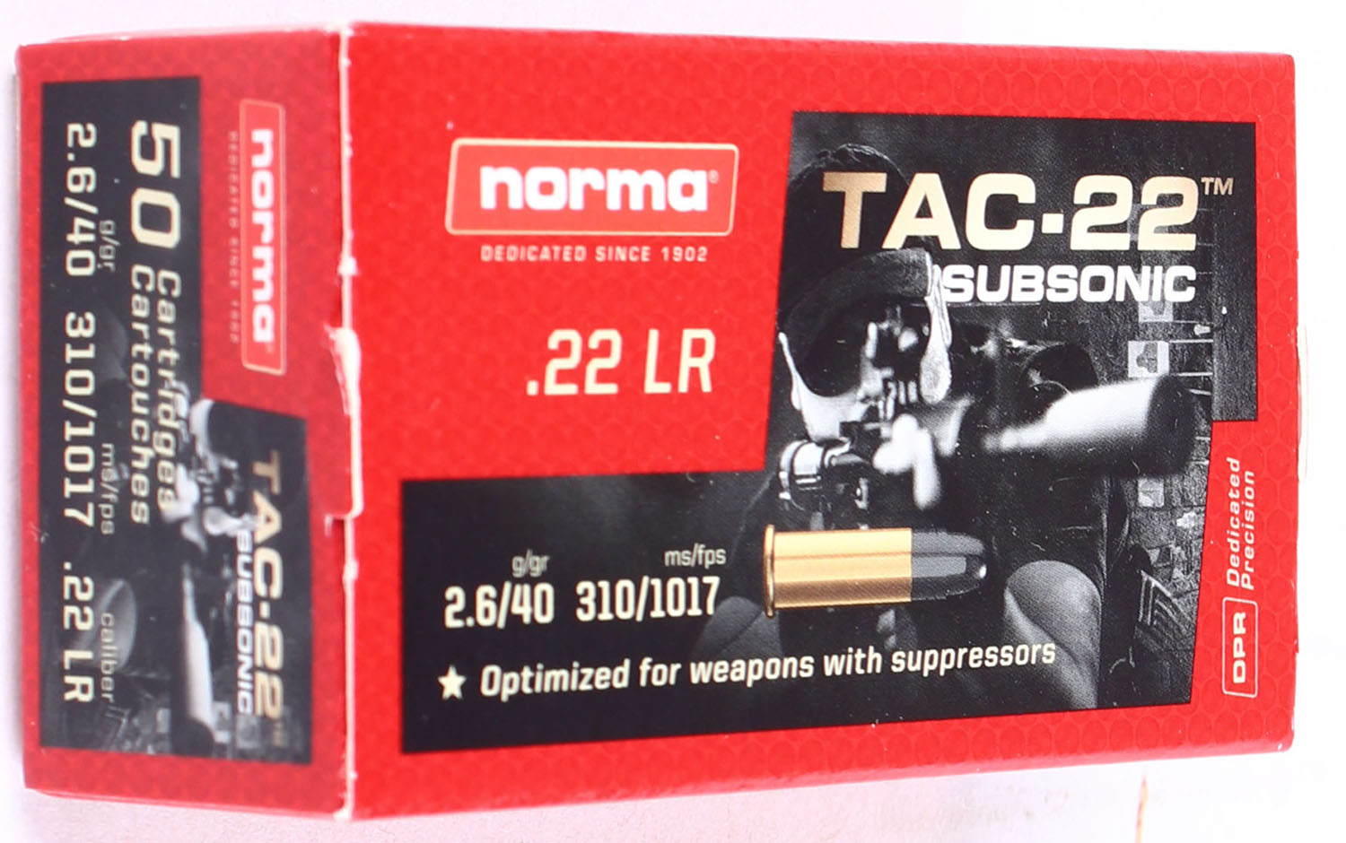 Norma, Tac-22 Subsonic, .22 Long Rifle, Lead Round Nose, 1083 FPS, Not in RHWeb, Full, 1pc. Red & black box, box is MINT with mint color, corners are sharp, edges are crisp, end flaps are solid, ammo is mint. Grade: MINT - Value: 8 to 12