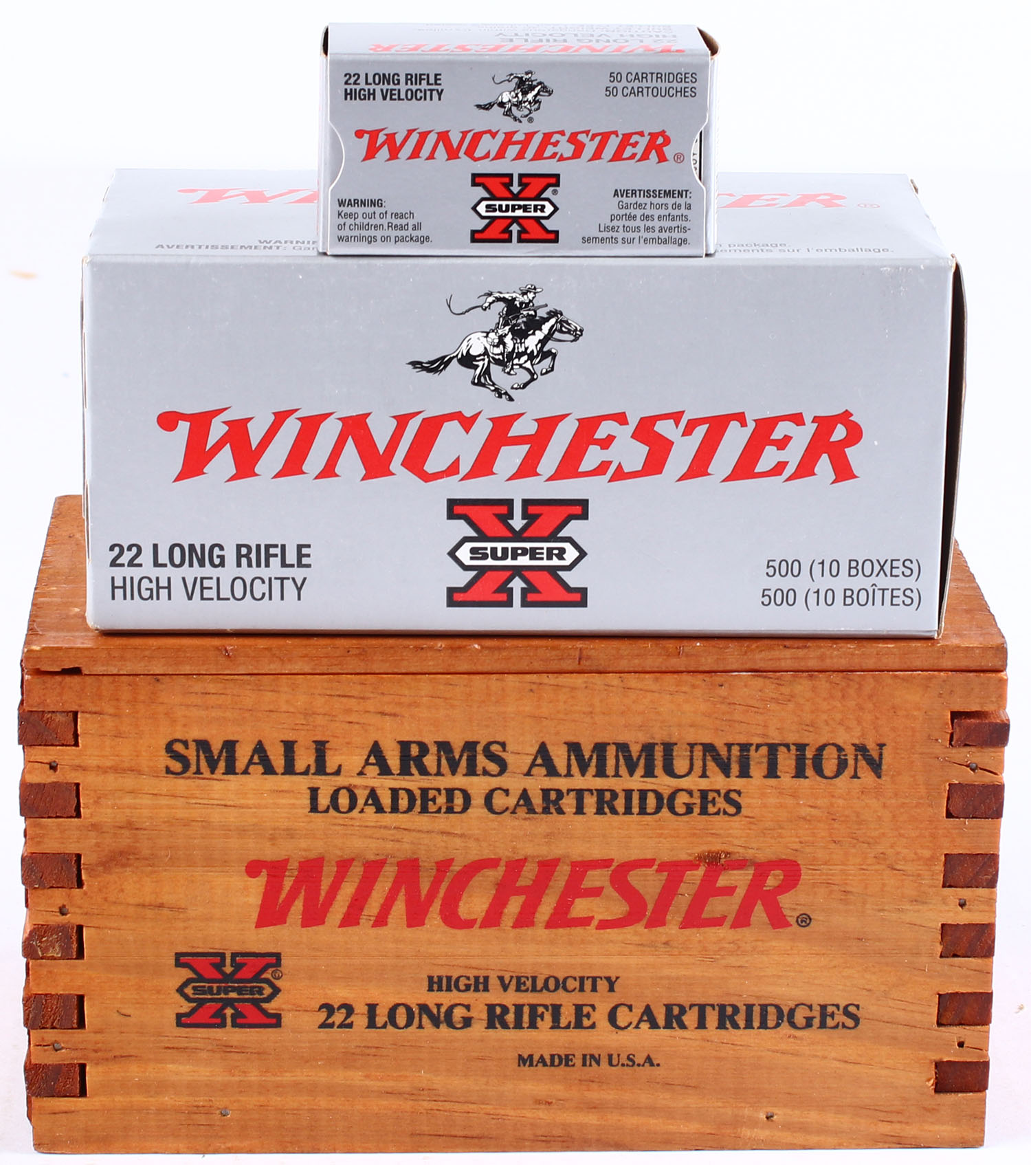 Winchester, Super-X, .22 Long Rifle, High Velocity, Full, 500rds. 1pc. Grey red white & black brick, comes in 2pc. wood crate, crate is solid with excellent color, only very minor shelf wear, brick is MINT with minty color, corners are sharp, edges are crisp, end flaps are solid, inside boxes are mint. Grade: MINT - Value: 40 to 90