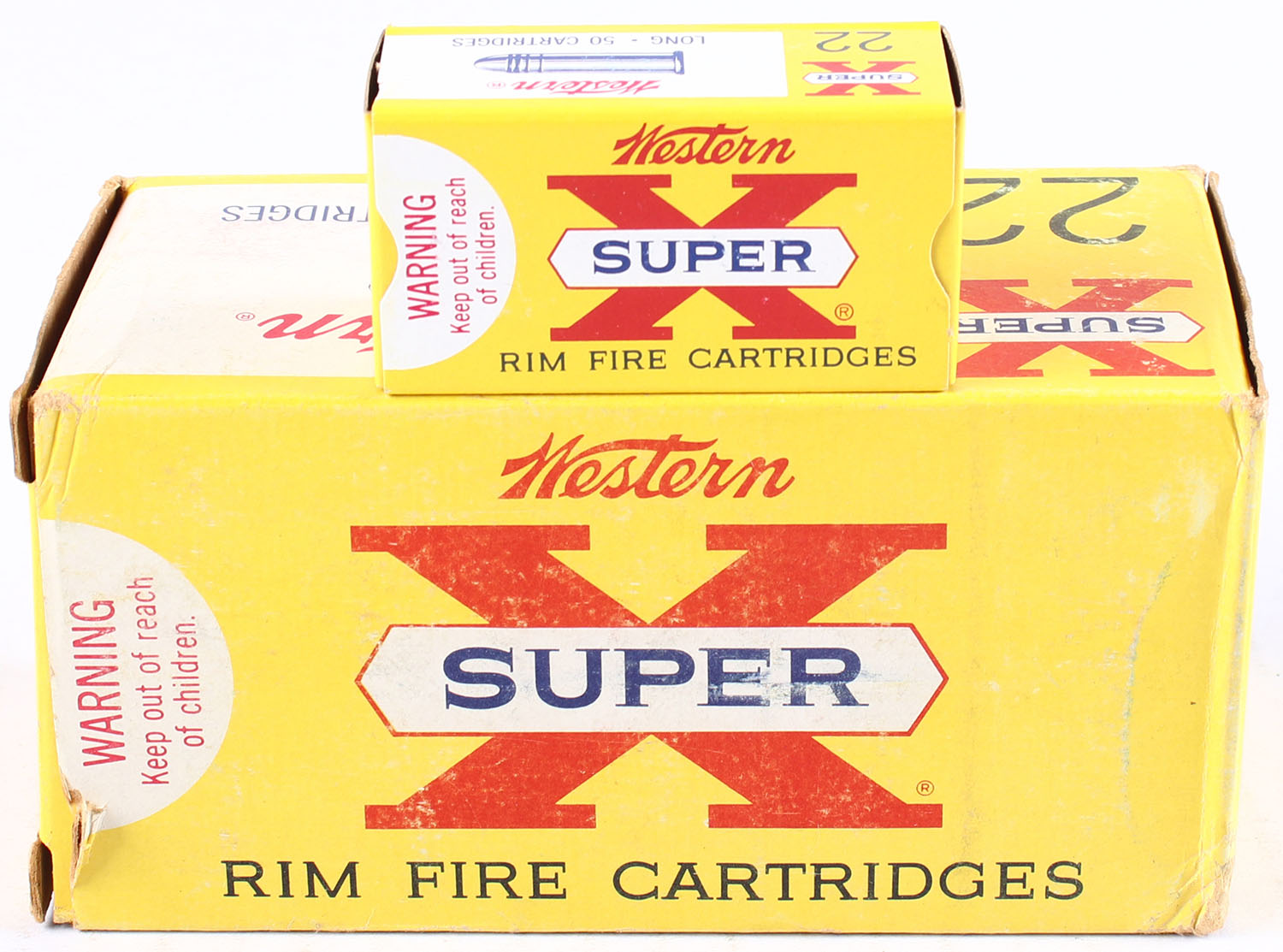 Western, Super-X, .22 Long, 29 Grain Lubaloy Coated Bullet, Full, 500rds., 1pc. Yellow white & red brick, brick is solid with very good color, some shelf wear & color fading, some corner & edge wear, end flaps are solid, inside boxes are mint. Grade: Very Good ++ - Value: 40 to 100