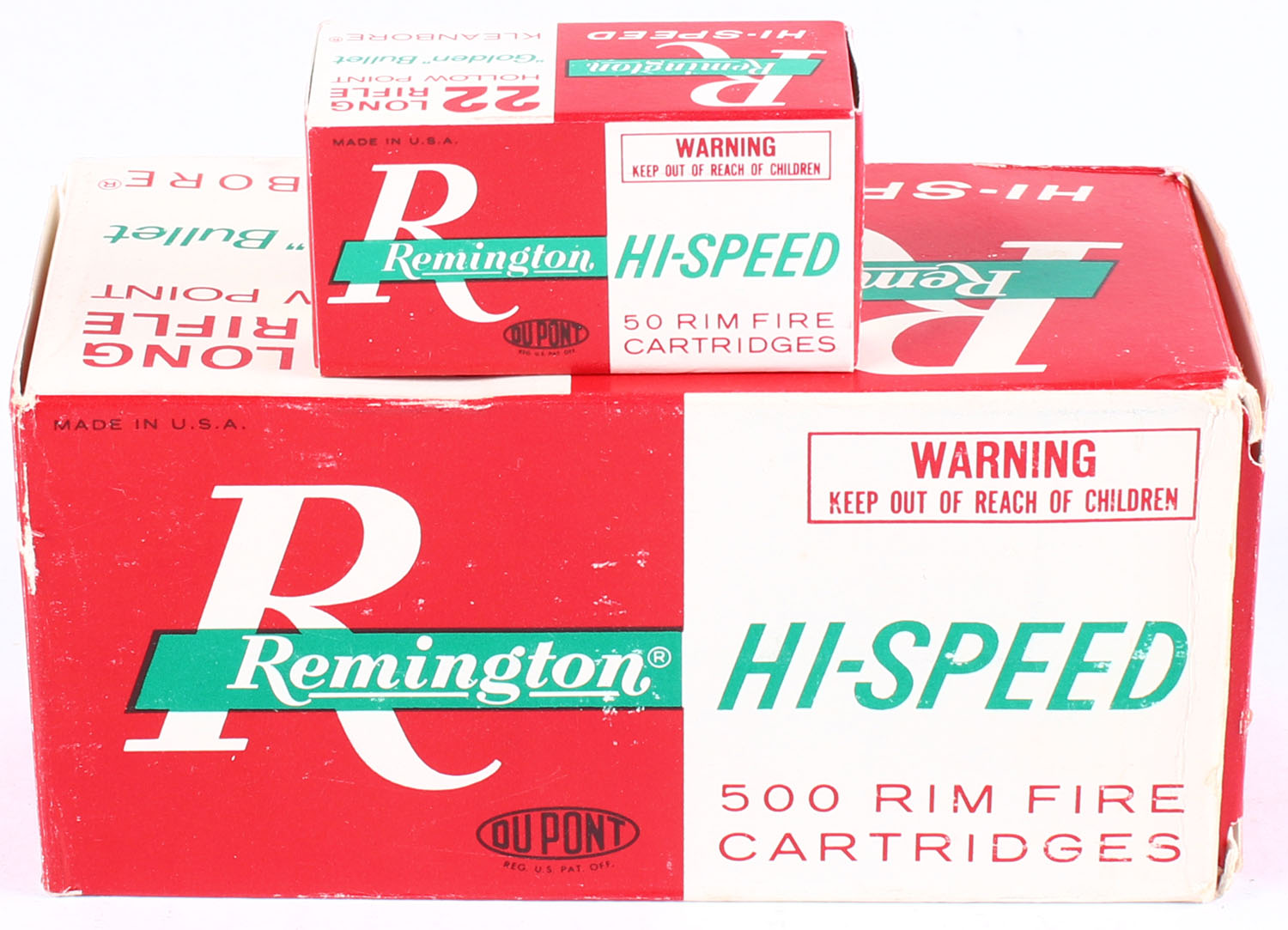 Remington, Hi-Speed Kleanbore, .22 Long Rifle Hollow Point, ''Golden'' Bullet, Full, 500rds., 1pc. Red white & green brick, brick is solid with excellent color, very minor shelf wear, has corner & edge wear, end flaps are solid, inside boxes are minty. Grade: Very Good ++ - Value: 40 to 120