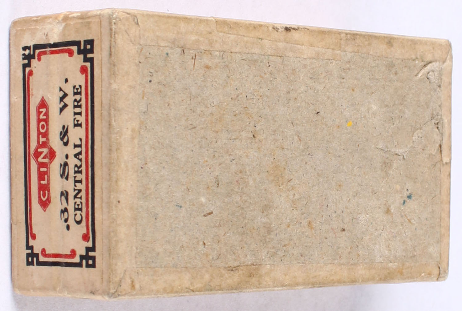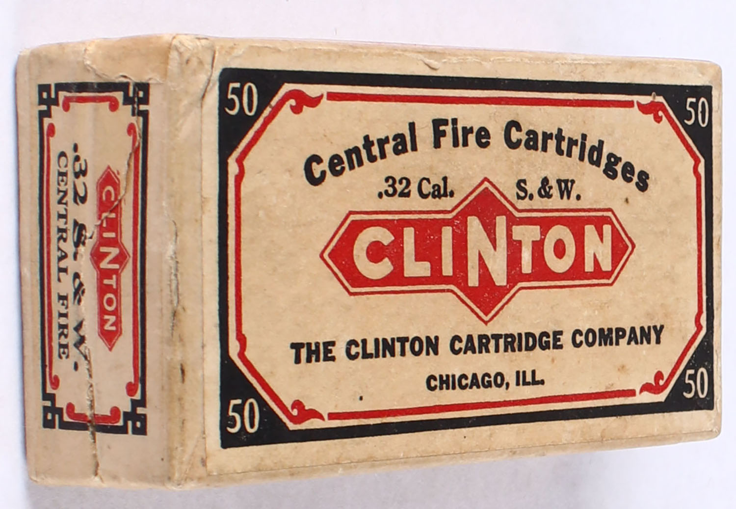 Clinton, Central Fire Cartridges, .38 Cal. S&W, FULL & SEALED, 2pc. Buff with red & black labels, box has excellent color, side sealing label is sealed, near mint condition. Grade: Excellent ++ - Value: 50 to 150