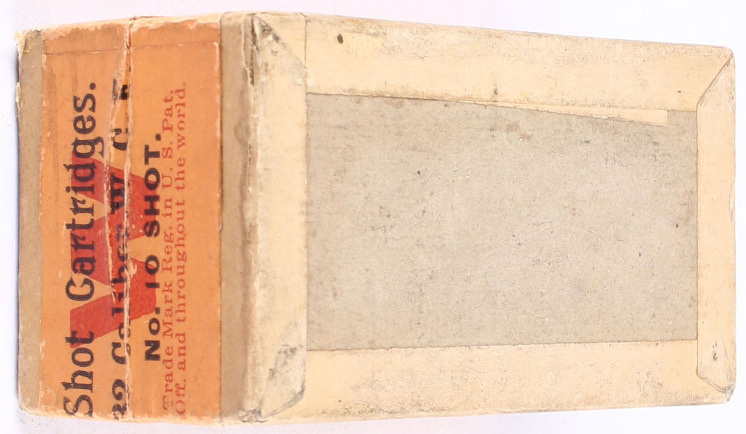 Winchester, .32 Shot Cartridges, Model 1873, No. 10 SHOT, 2pc, Full, buff box with blue/orange label & black print, box is solid with a clean seam split to one edge on top, nice color to label, ammo is excellent. Grade: Excellent - Value: 200 to 500