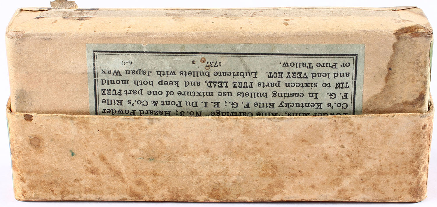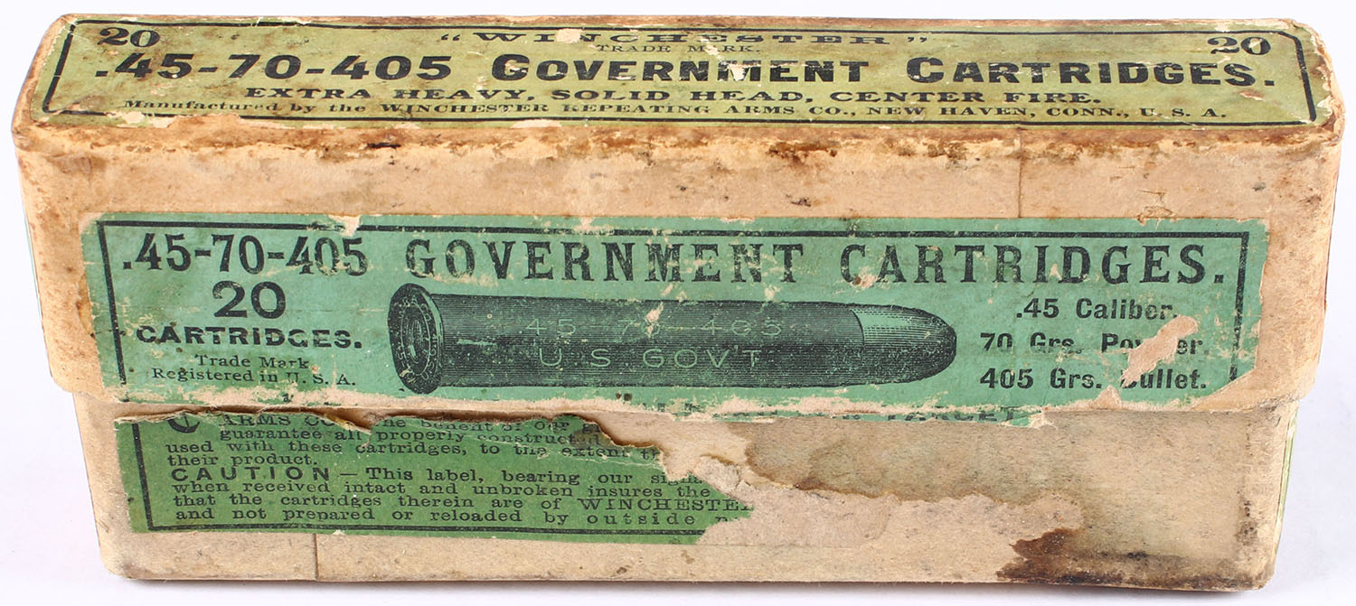 Winchester, .45-70 Government Cartridges, 405 Gr. Extra Heavy Solid Head bullet, 2pc, Full, buff box with green label & black print, box is solid with age soiling & scuffing, ammo ranges from very good to fair. Grade: Very Good + - Value: 50 to 75