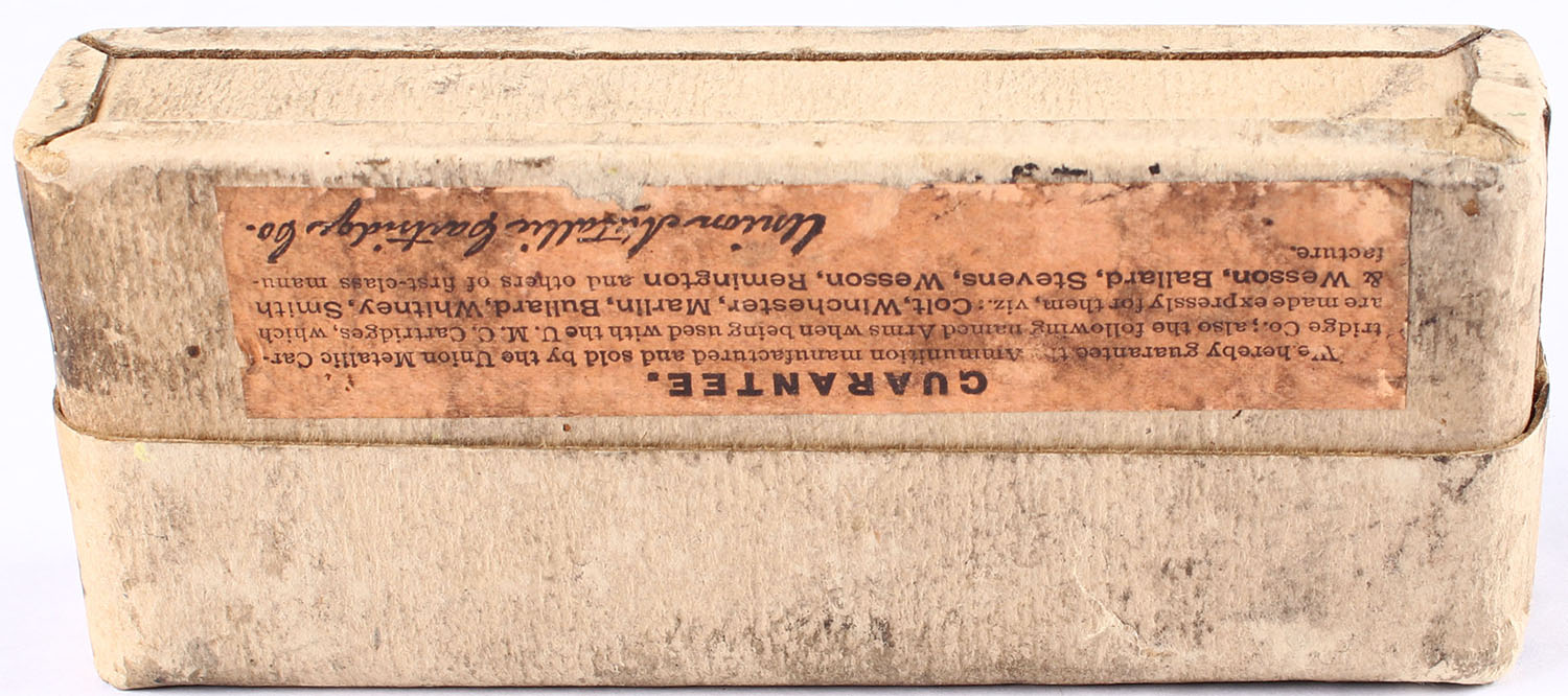 UMC, .45-60-300 Winchester, 300 Gr. Bullet, 2pc, Full, buff box with green label & black print, box is solid with light age spotting, light rub marks, & light edge wear, ammo is excellent. Grade: Very Good + - Value: 40 to 100