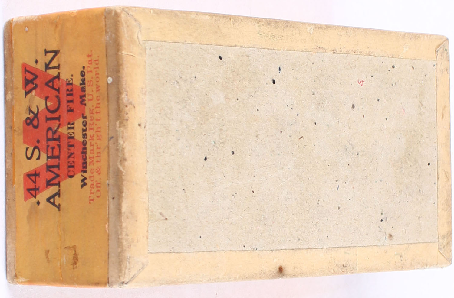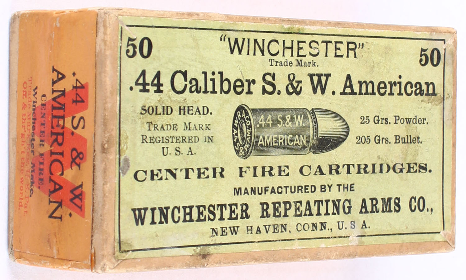 Winchester, .44 Smith & Wesson American, 205 Grain Bullet, FULL & SEALED, 2pc. Buff box with green & orange labels, box is solid with excellent color, label is intact. Grade: Excellent - Value: 200 to 500