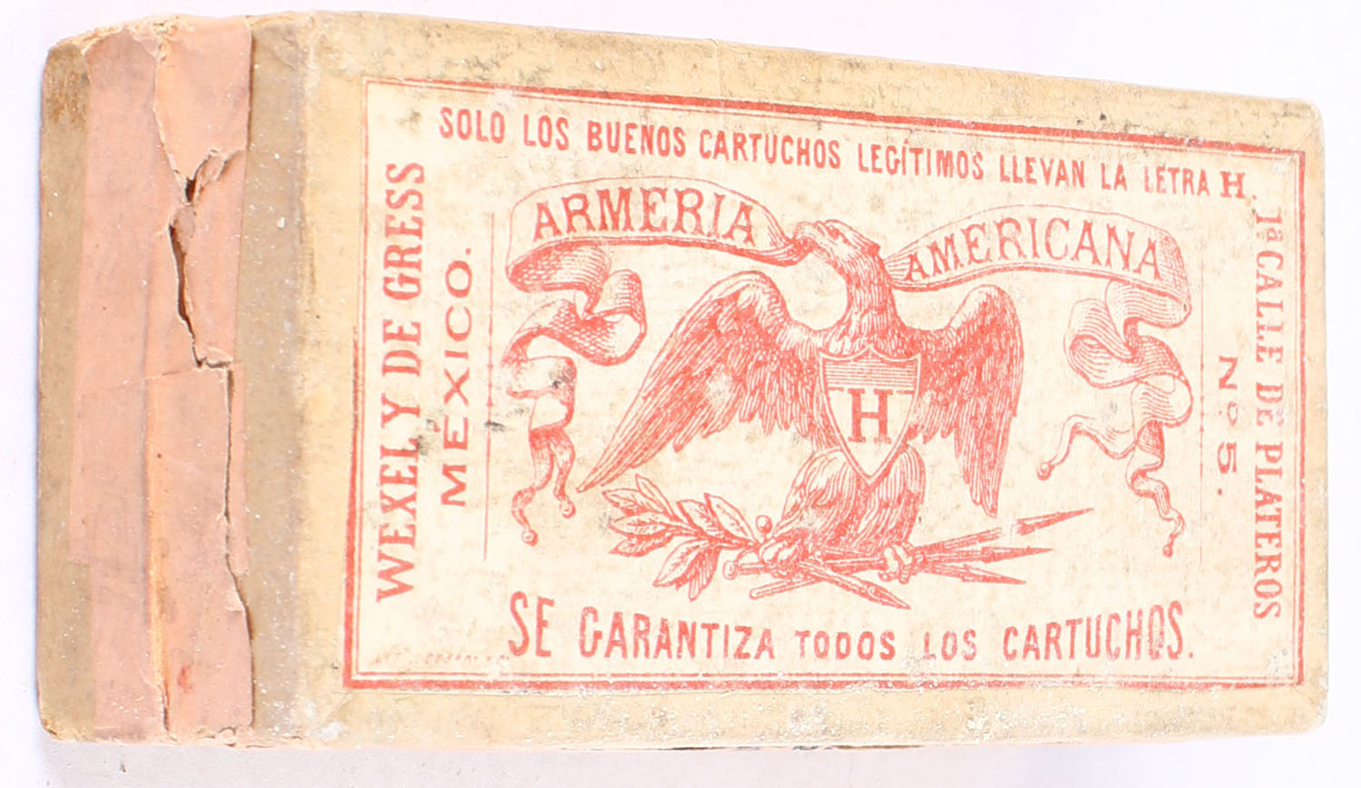 Winchester, Metallic Cartridges, .38 Long Rim Fire, Full & Sealed on two sides, 2pc. Buff box with green top label &orange side sealing band, box is solid with nice color to label, some light scuffing, bottom has Rare Mexico label, label is 98% intact. Grade: Very Good ++ - Value: 50 to 200