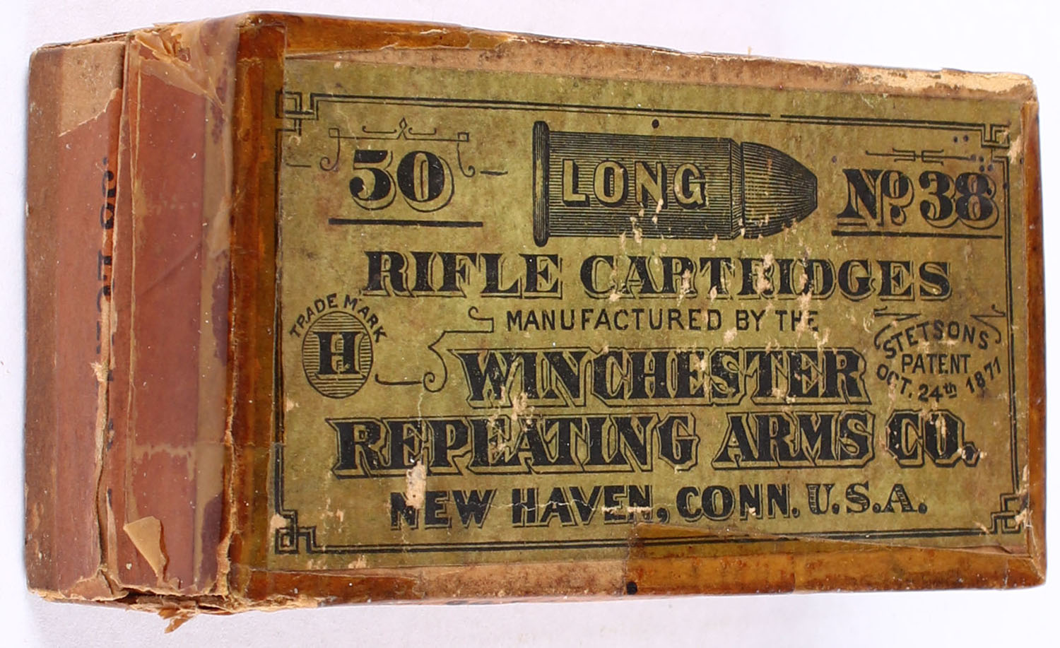 Winchester .38 Long R.F., 2pc, Full, buff box with green top label & orange side label with black print, box has tape repairs to top otherwise solid with age soiling, ammo is fair. Grade: Good - Value: 30 to 90