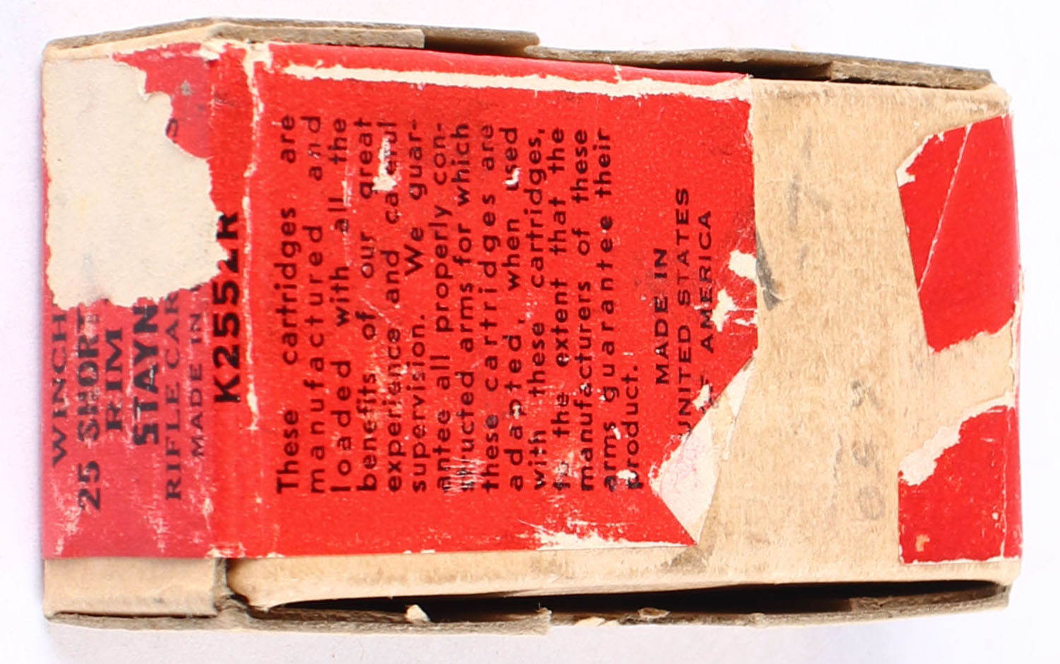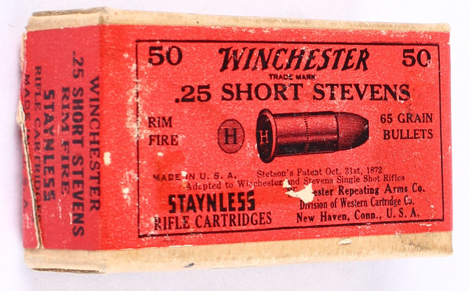 Winchester, .25 Short Stevens R.F., Staynless, Full & sealed on one end, 2pc. Buff box with orange wraparound label, box is solid with excellent color, light rub marks & minor edge wear, ammo is near mint. Grade: Excellent + - Value: 100 to 200