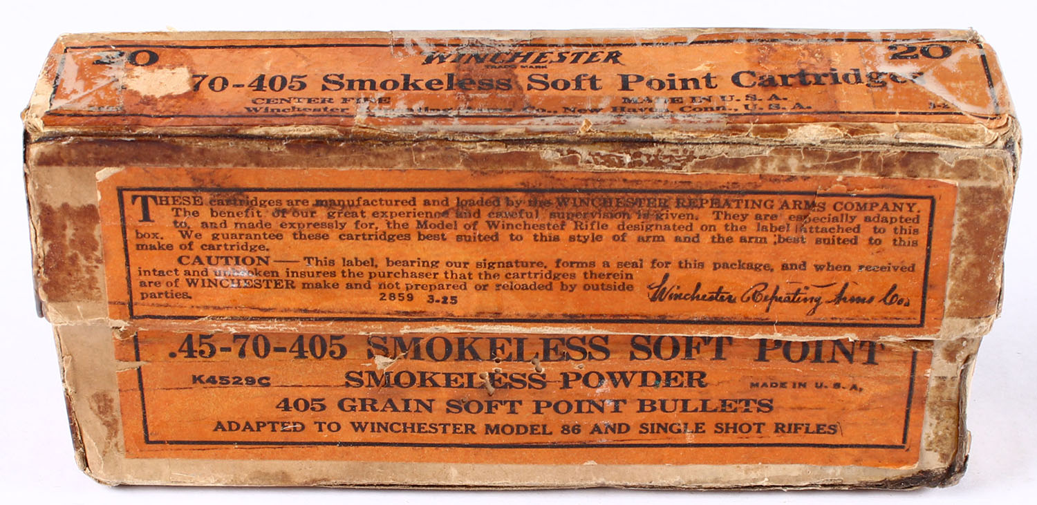 Winchester, Smokeless Cartridges, .45-70-405, Soft Point Cartridges, Full, 2pc. Buff box with orange labels, box is solid with good color, age soiling, staining, tape all over lid, edge & corner wear, labels are intact, ammo is very good. Grade: Good - Value: 30 to 90