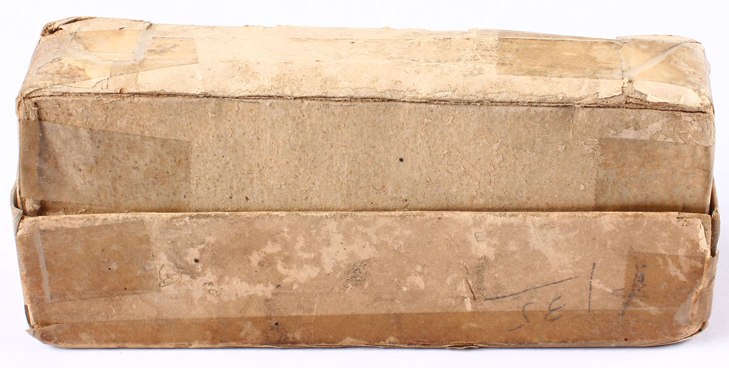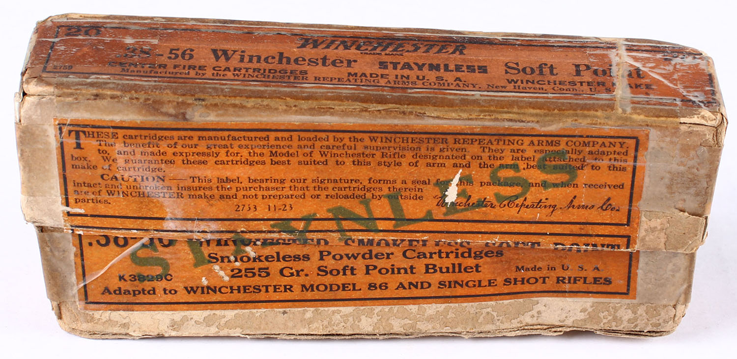 Winchester, Center Fire Cartridges, .38-56 Winchester, Staynless, 255 Gr. Soft Point Bullet, Full, 2pc. Buff box with orange labels, green ''Staynless'' over-stamp, box is solid with good color, lid has several seam splits that are taped, age soiling, edge & corner wear, labels are intact, ammo is excellent. Grade: Good - Value: 40 to 120