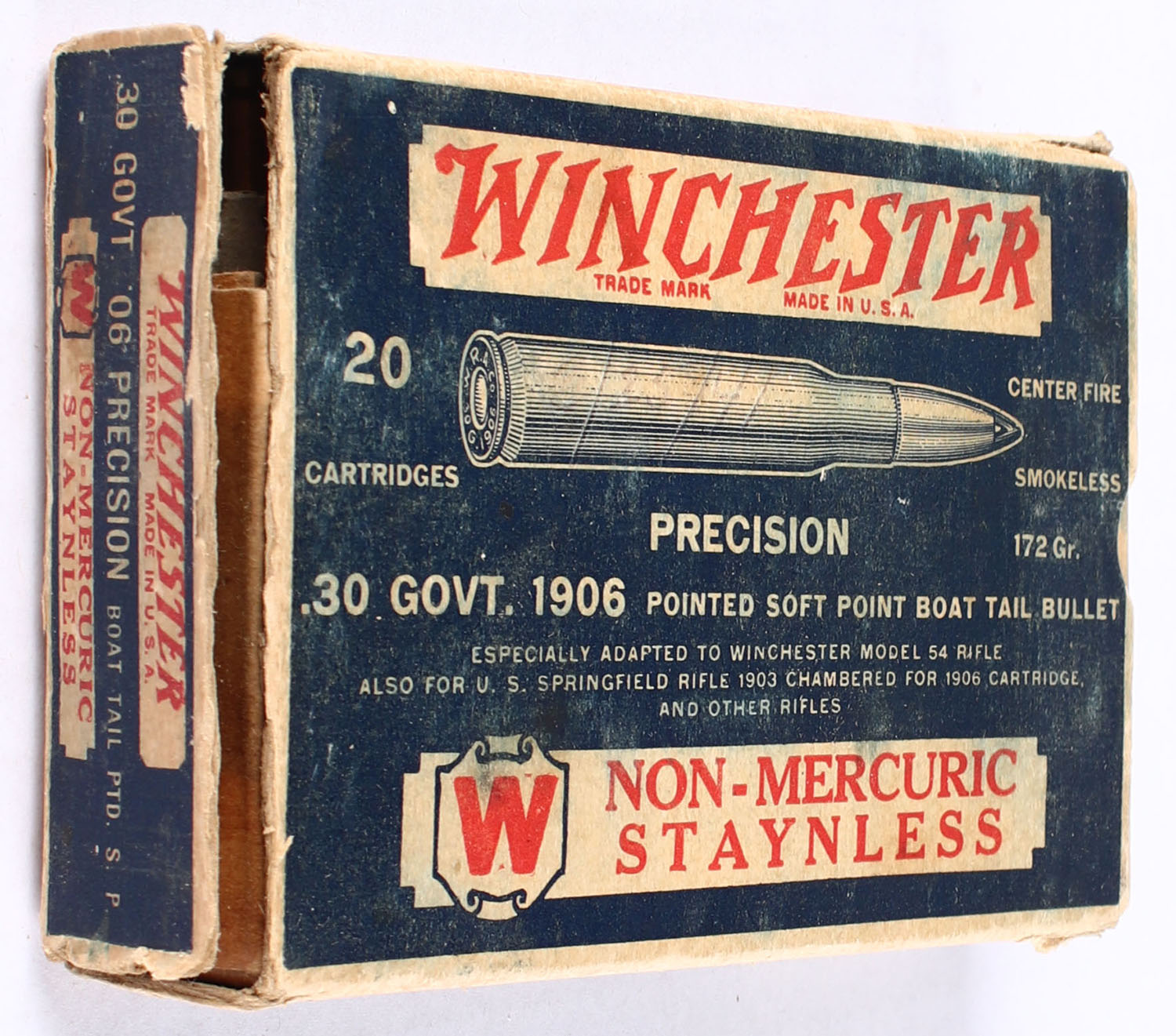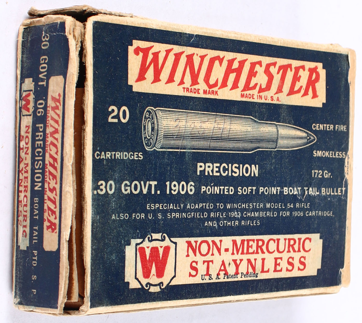 Winchester, Non-Mercuric Staynless, .30 Govt. 1906, 172 Gr. Pointed Soft Point Boat Tail Bullet, Partial 15rds., 1pc. Blue white & red box, box has both torn end flaps with some edge wear, ammo is good. Grade: Good ++ - Value: 30 to 80