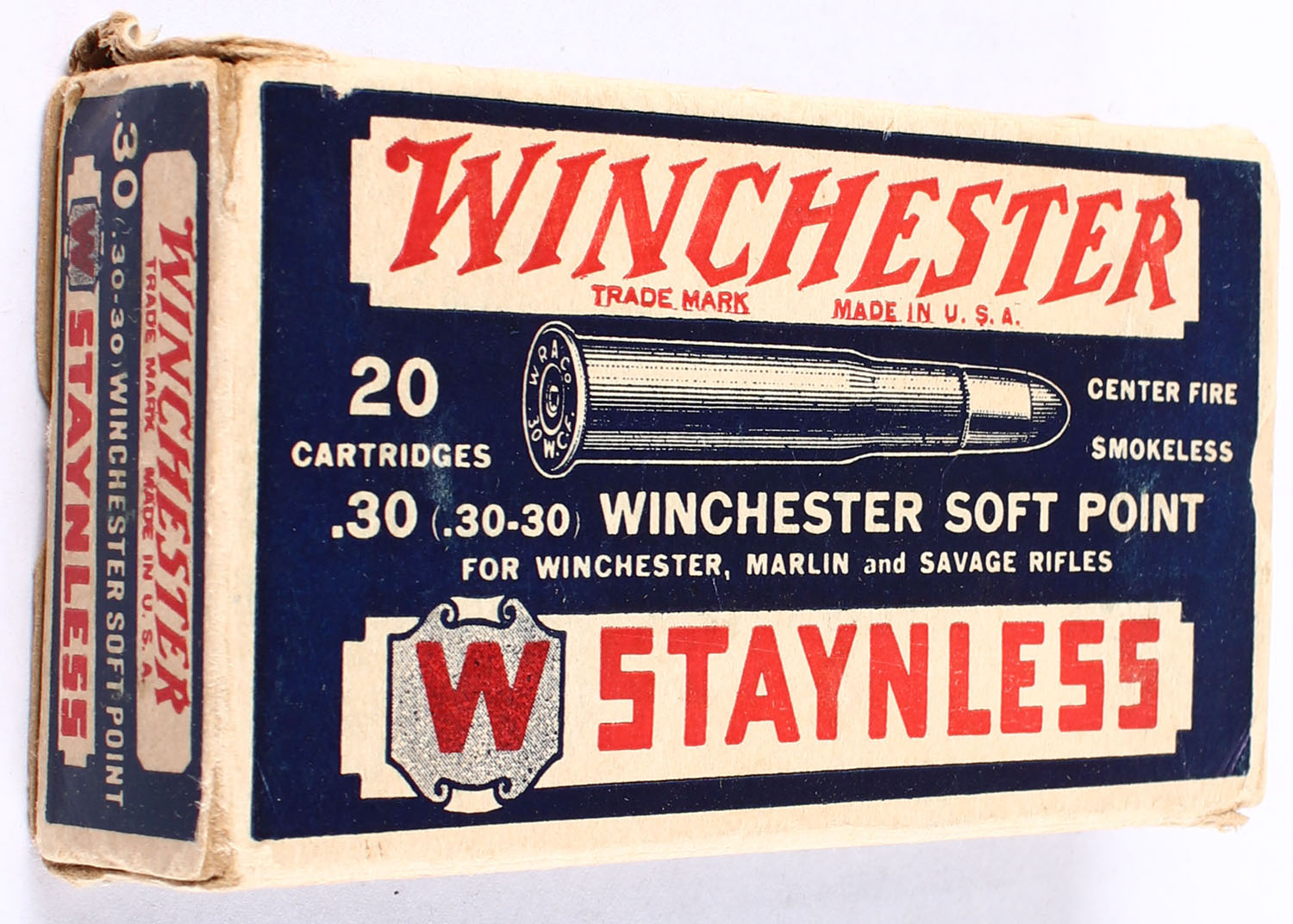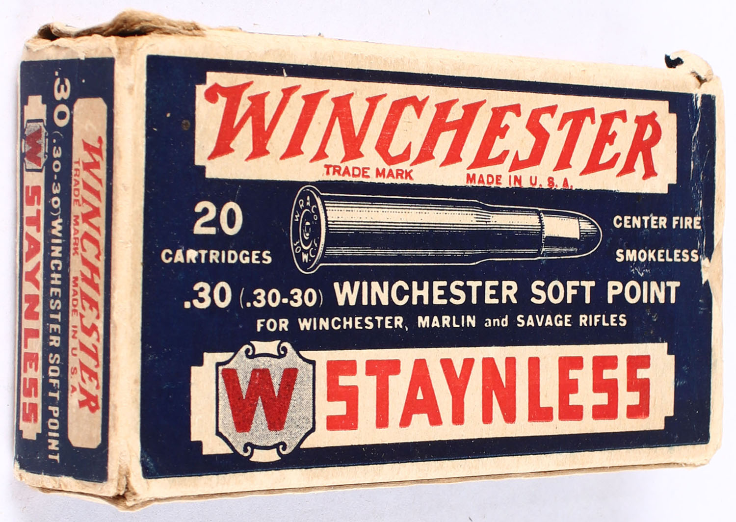 Winchester, Non-Mercuric Staynless, .30-30 Winchester Soft Point, Full, 1pc. Blue white & red box, box is solid with excellent color, minor corner wear, end flaps are solid, ammo is very good. Grade: Excellent - Value: 50 to 100