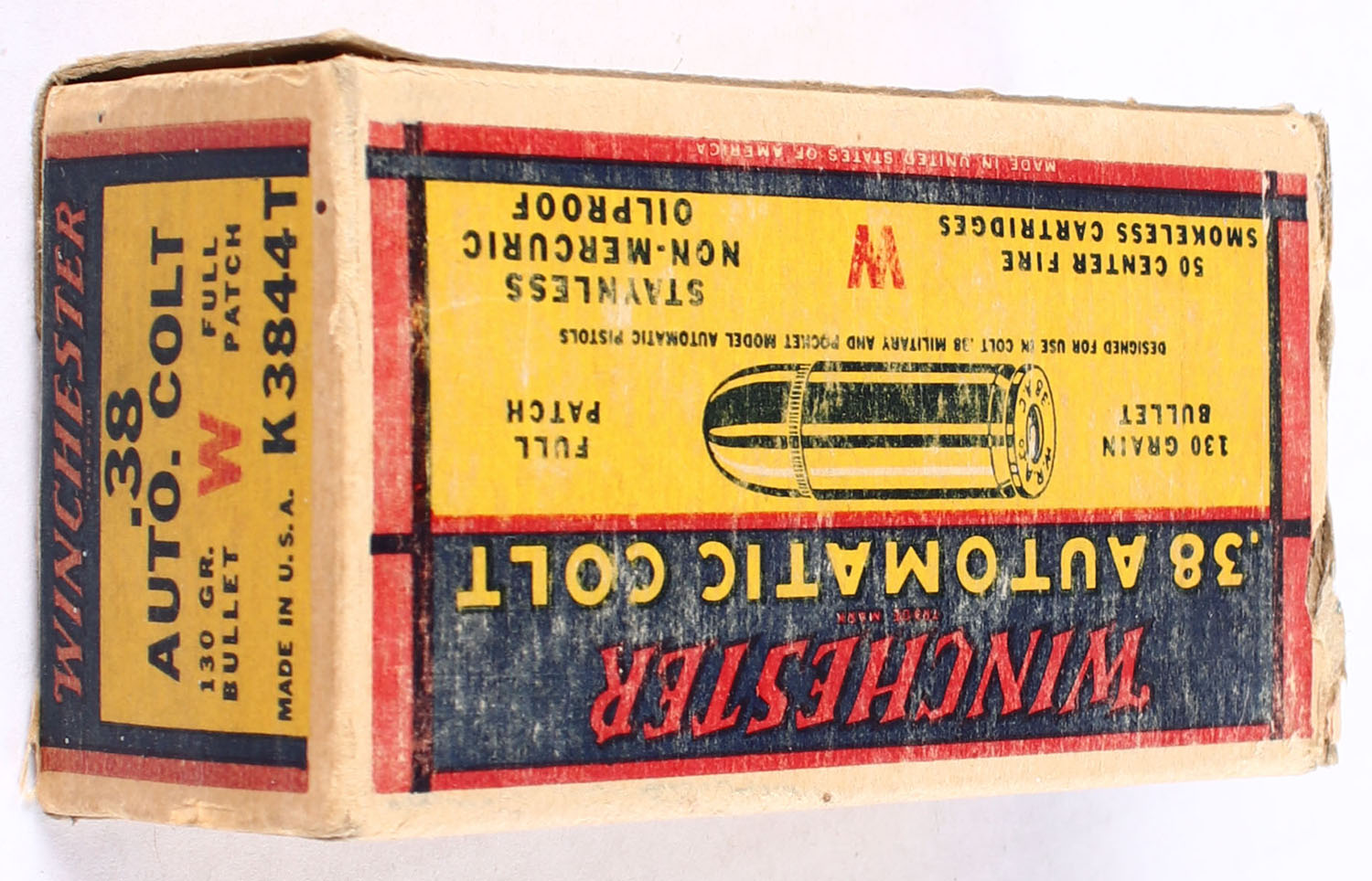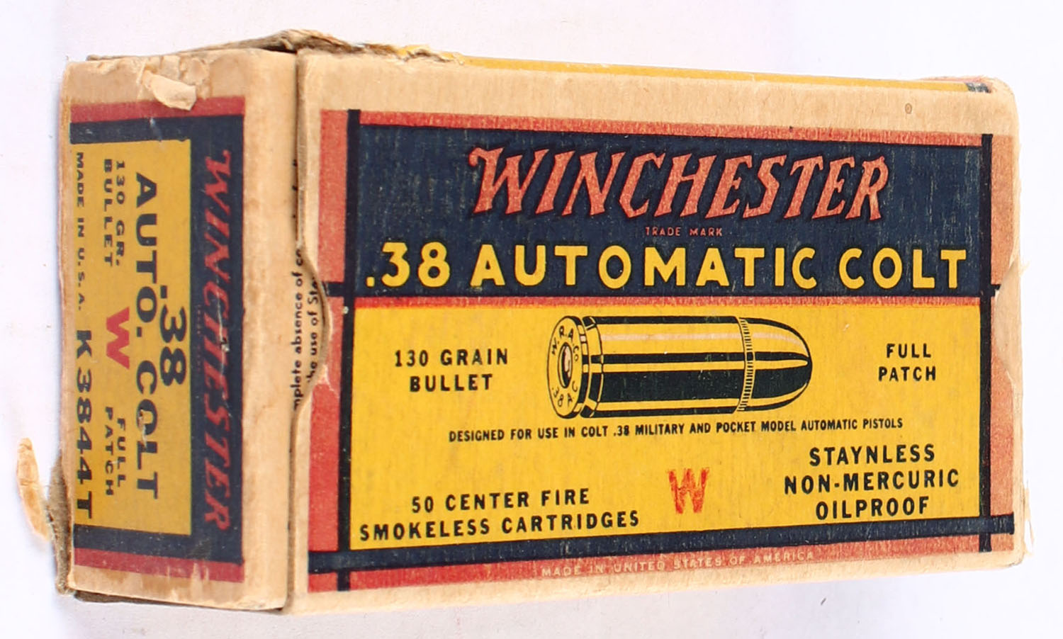Winchester, .38 Automatic Colt, 130 Grain Full Patch Bullet, Full, 1pc., yellow blue & red box, box is solid with very good color, minor fading, some corner wear, edges are mostly crisp, end flaps are solid, ammo is near mint. Grade: Very Good ++ - Value: 30 to 90