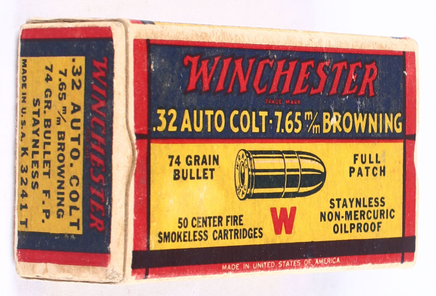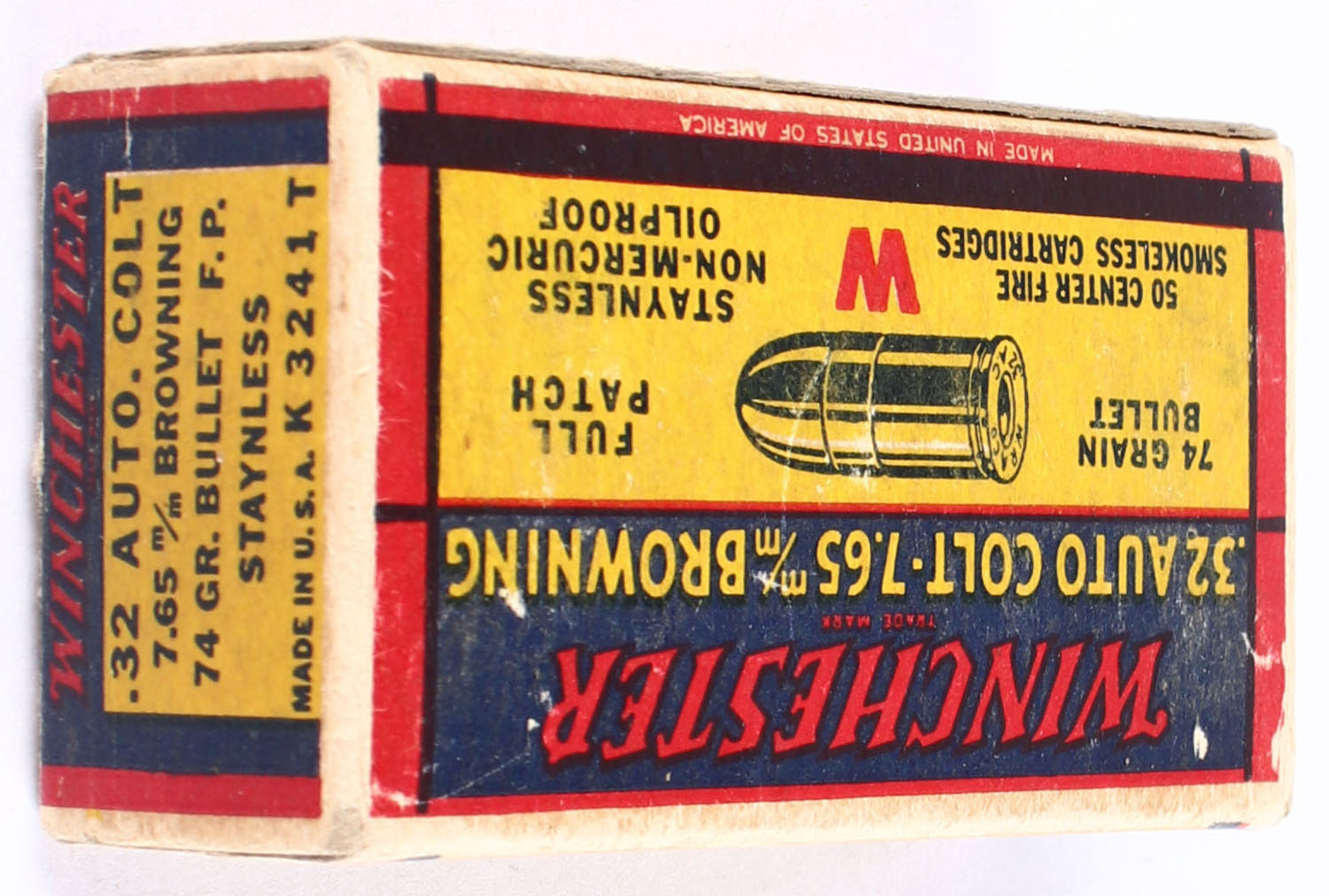 Winchester, Smokeless Cartridges, .32 Automatic Colt (7.65mm Browning), 74 Grain Full Patch Bullet, Full, 1pc. Yellow blue & red box, box is solid with very good to excellent color, minor age soiling, very minor corner wear, edges are mostly crisp, end flaps are solid, ammo is excellent. Grade: Excellent - Value: 20 to 60