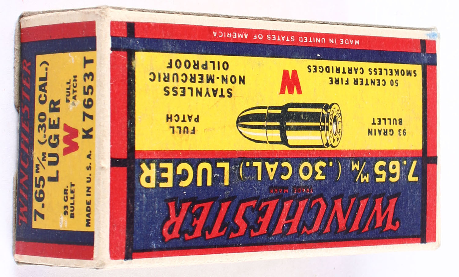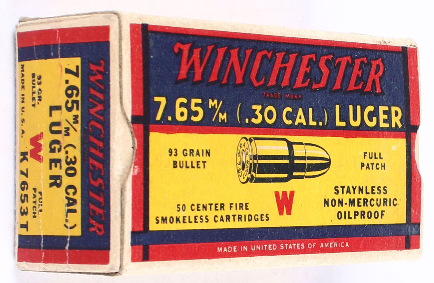 Winchester, Smokeless Cartridges, 7.65mm (.30 Luger), 93 Grain Full Patch Bullet, Full, 1pc. Yellow blue & red box, box is solid with excellent color, very minor corner wear, edges are crisp, end flaps are solid, ammo is excellent. Grade: Excellent ++ - Value: 20 to 60